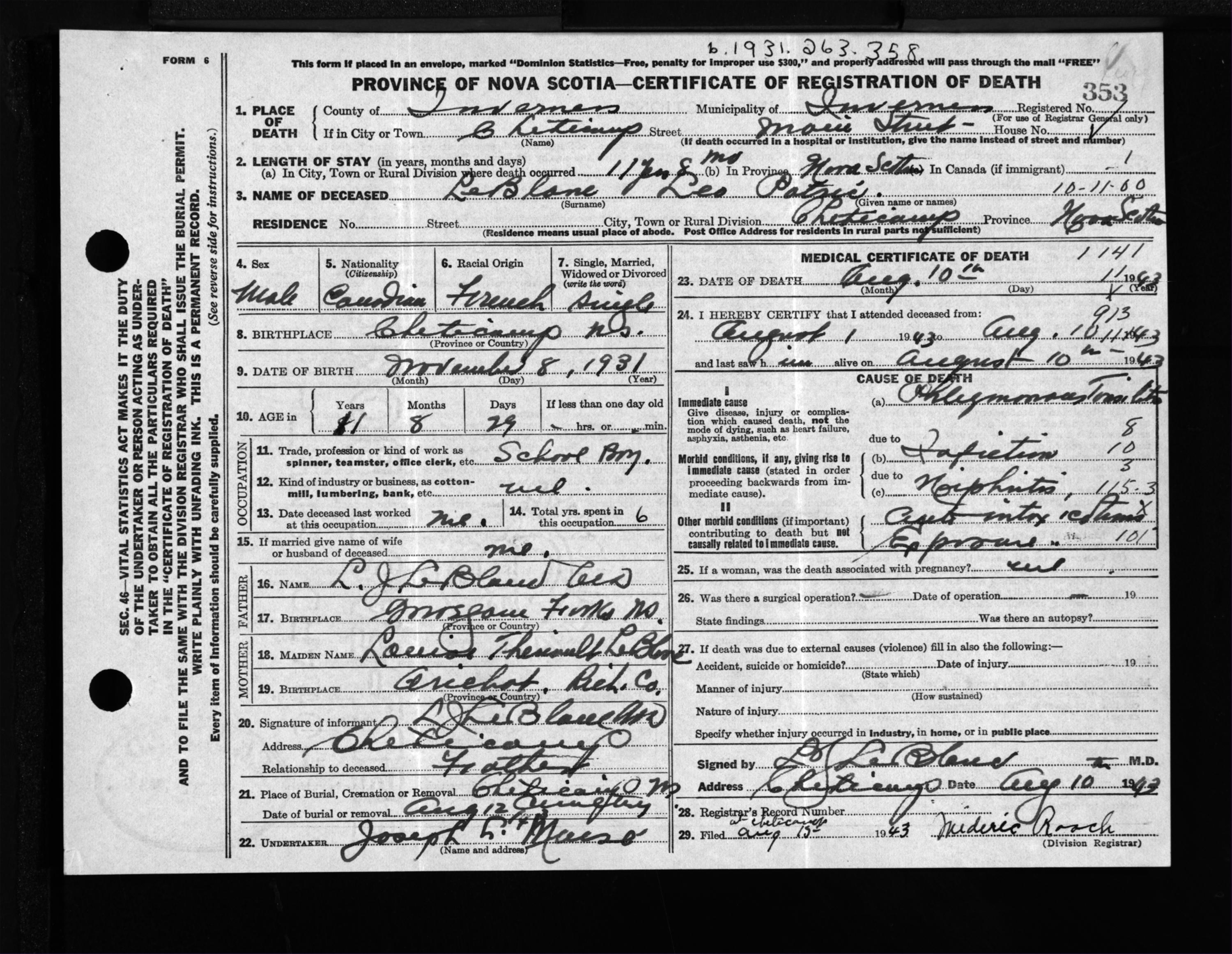 Male Death Registration: Year: 1943 file: 207 number: 353