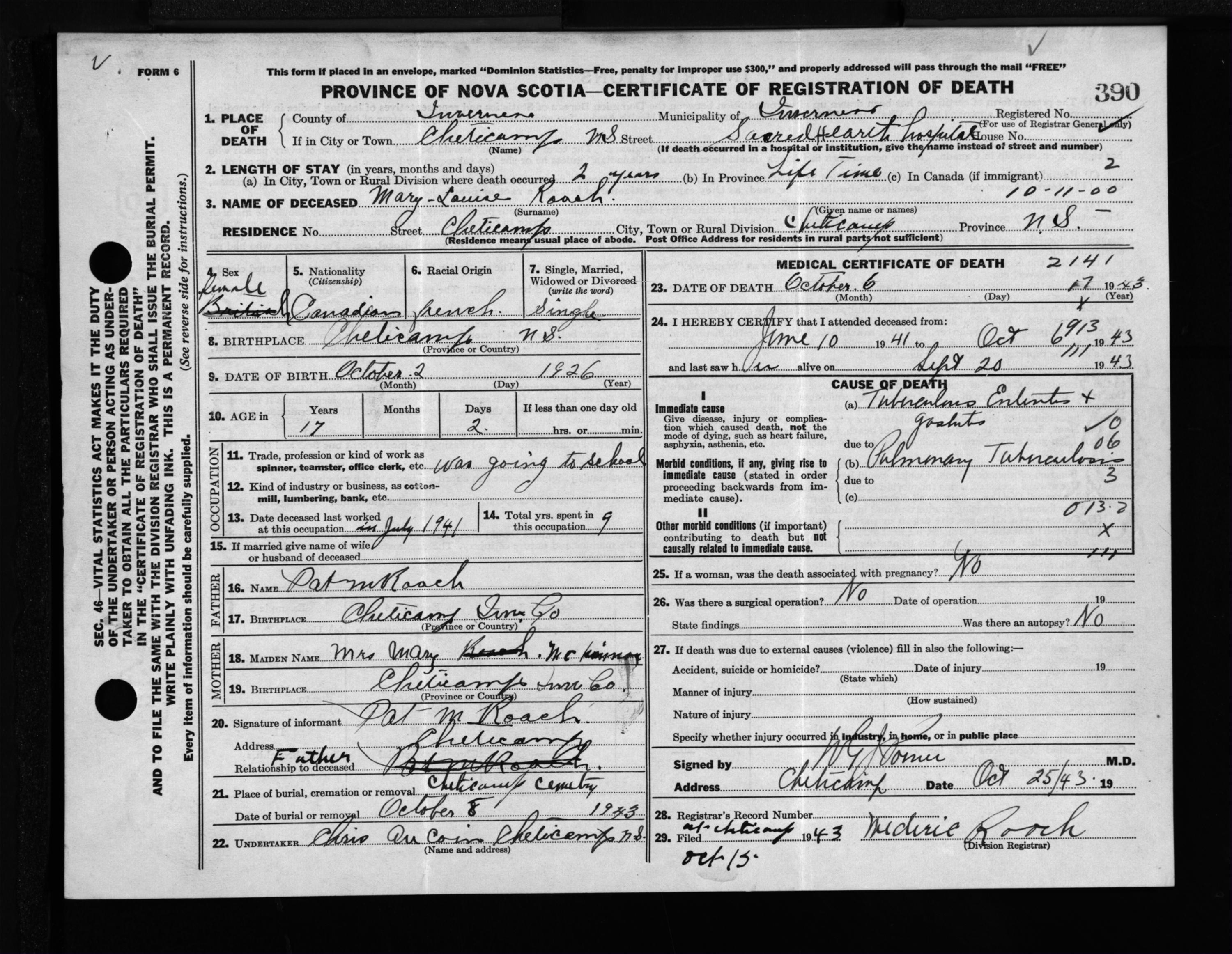 Female Death Registration: Year: 1943 file: 207 number: 390