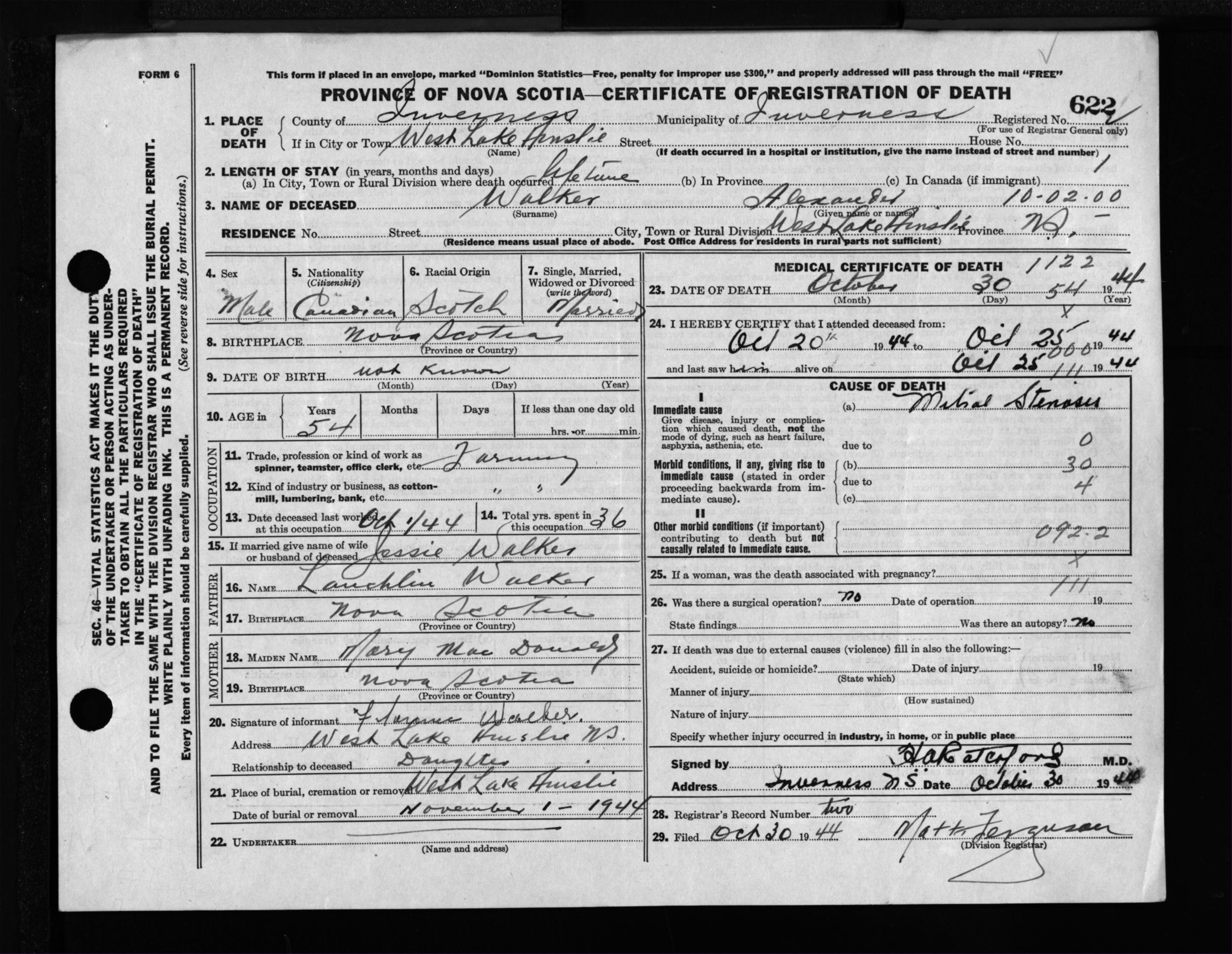 Male Death Registration: Year: 1944 file: 207 number: 622