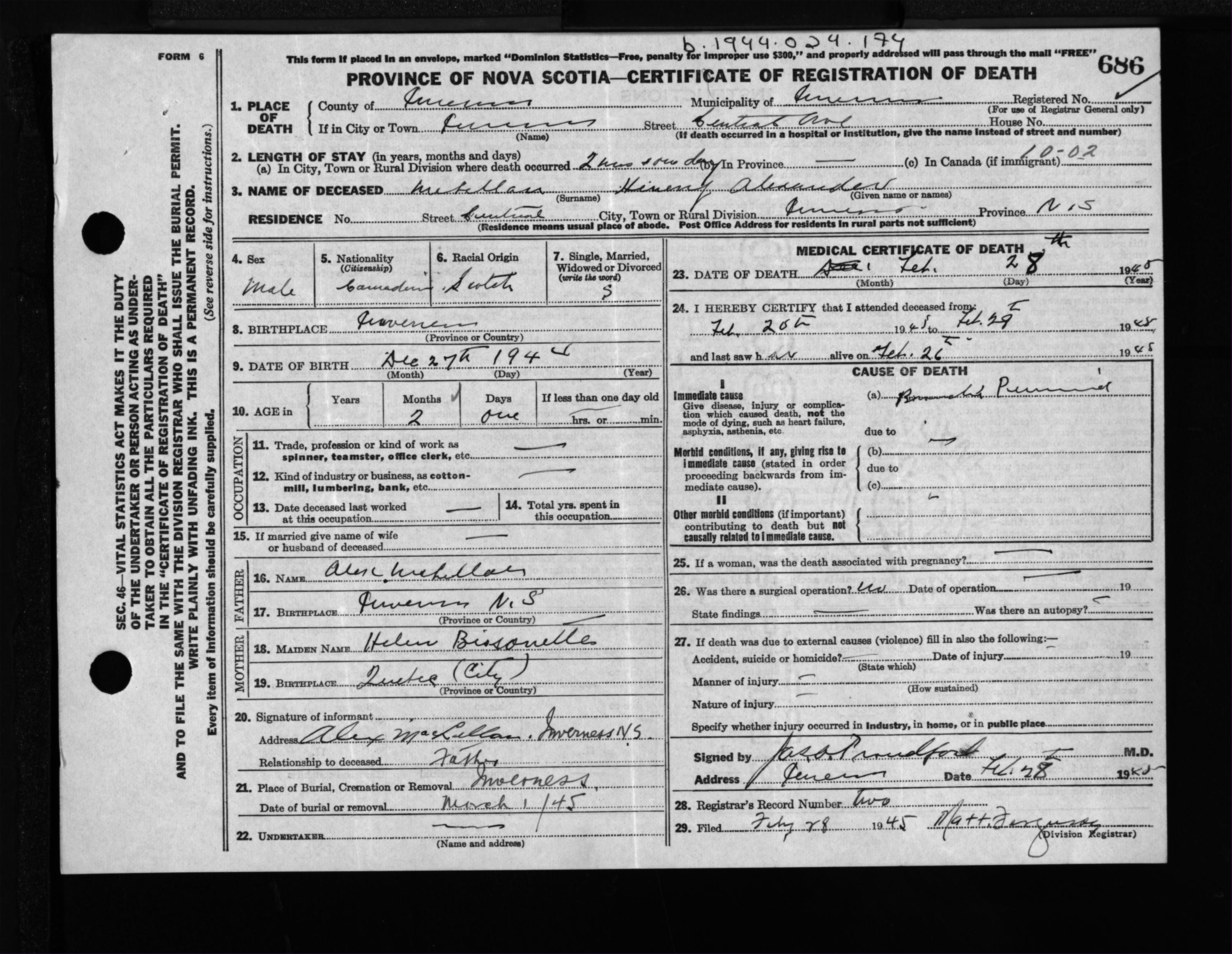 Male Death Registration: Year: 1945 file: 207 number: 686