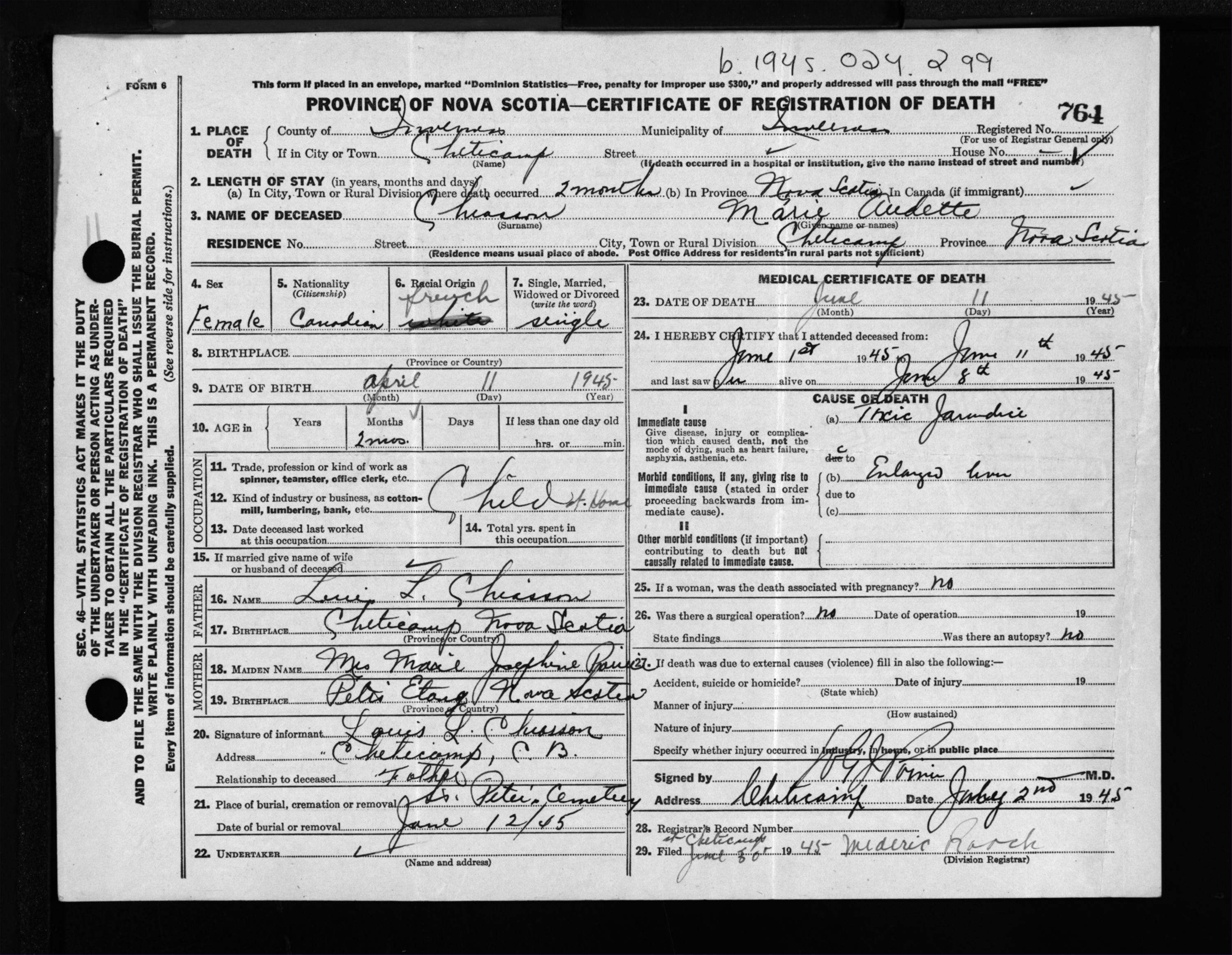 Female Death Registration: Year: 1945 file: 207 number: 764