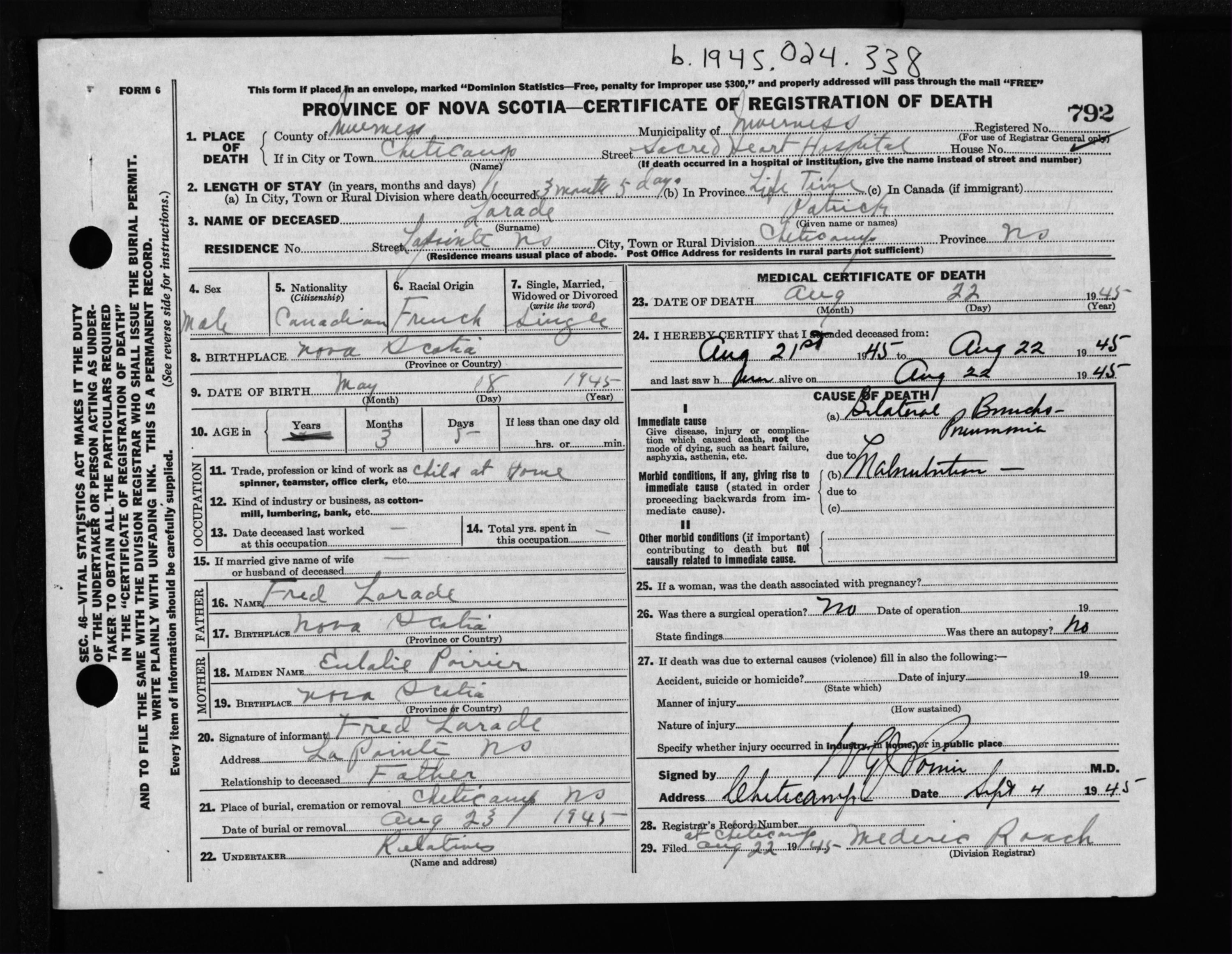 Male Death Registration: Year: 1945 file: 207 number: 792