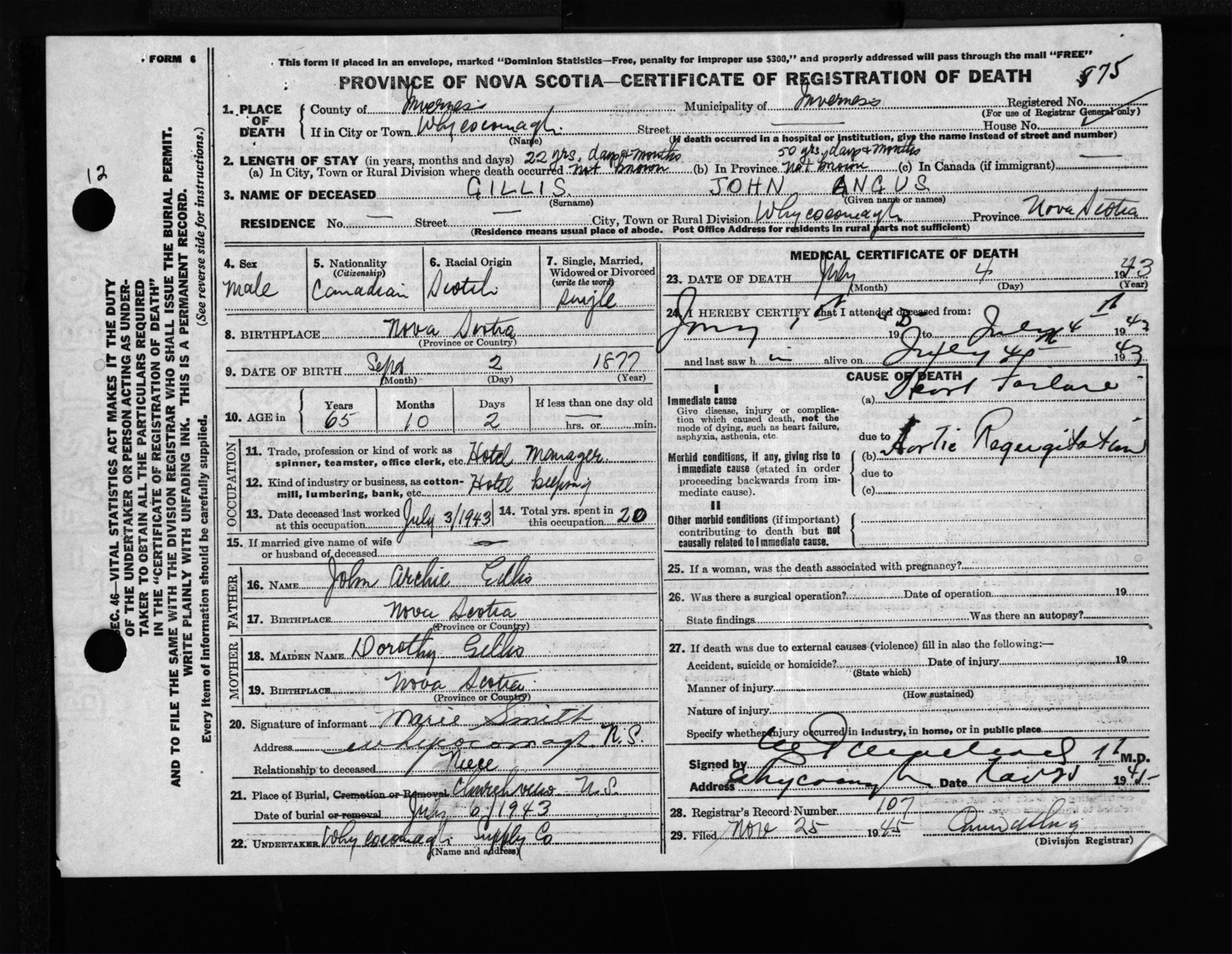 Male Death Registration: Year: 1943 file: 207 number: 875