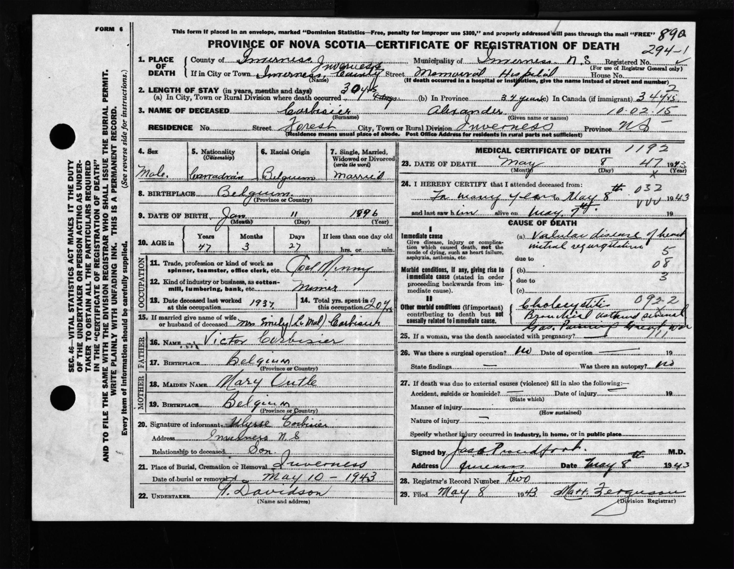 Male Death Registration: Year: 1943 file: 207 number: 890