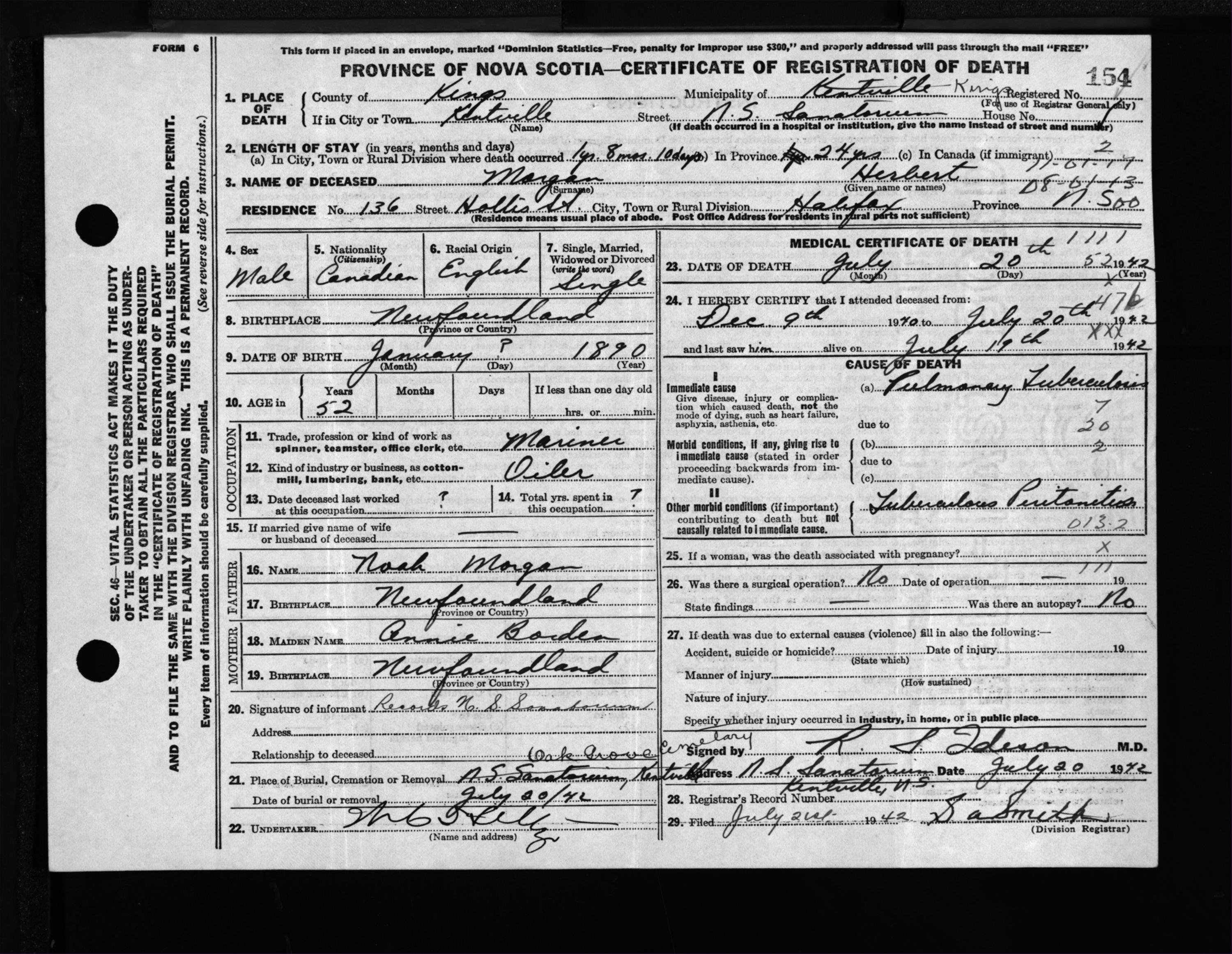 Male Death Registration: Year: 1942 file: 208 number: 154