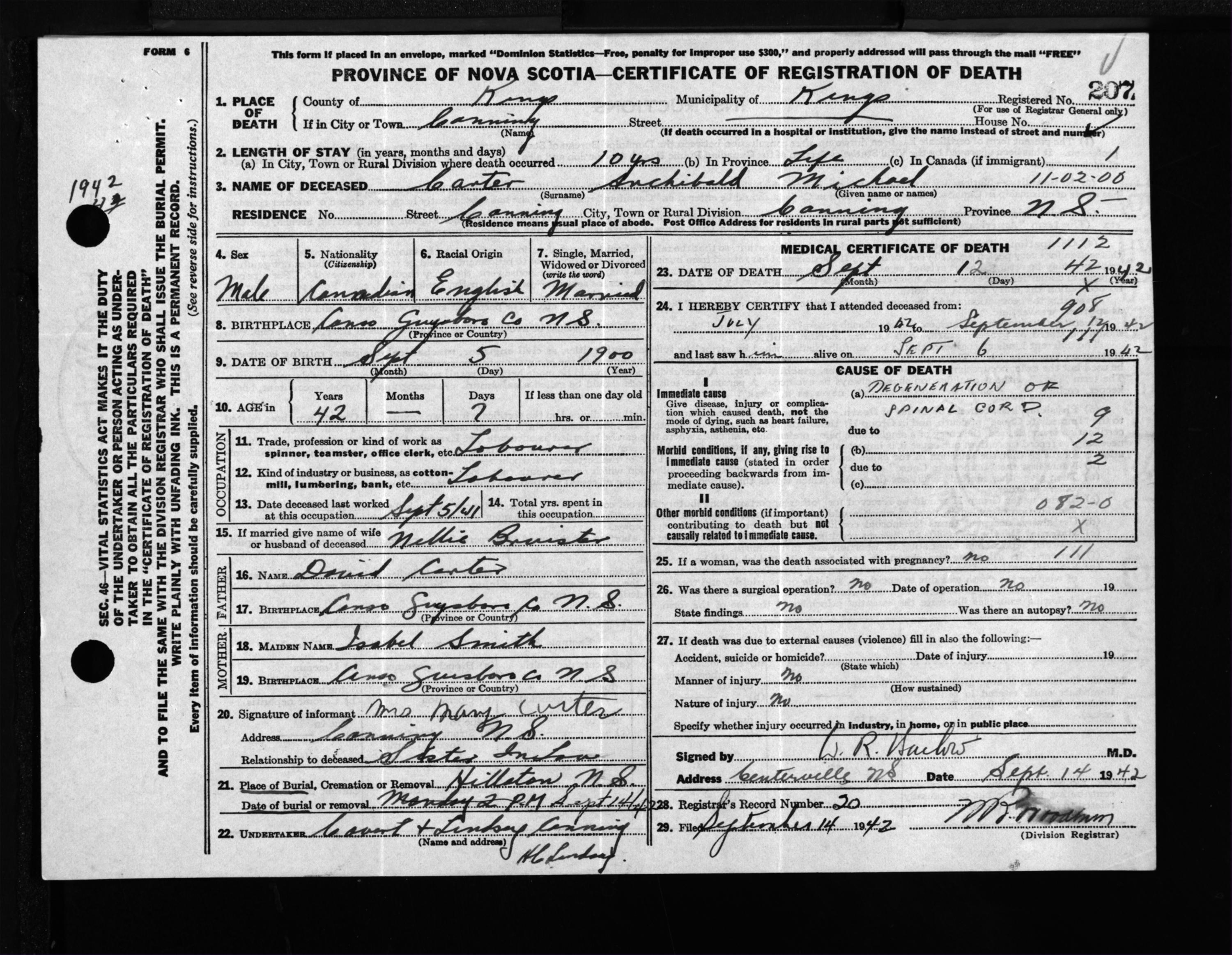 Male Death Registration: Year: 1942 file: 208 number: 207