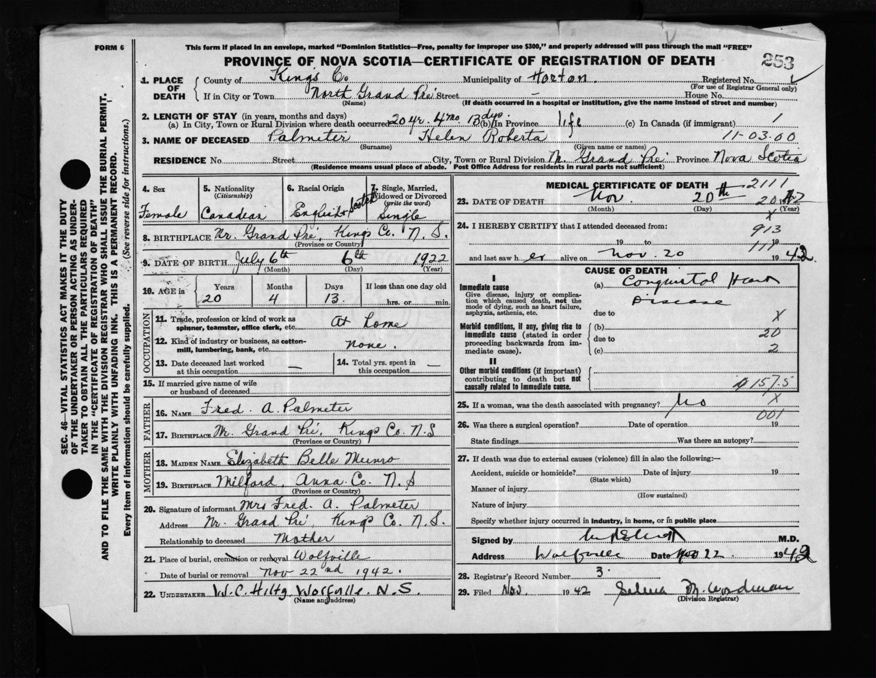Female Death Registration: Year: 1942 file: 208 number: 253