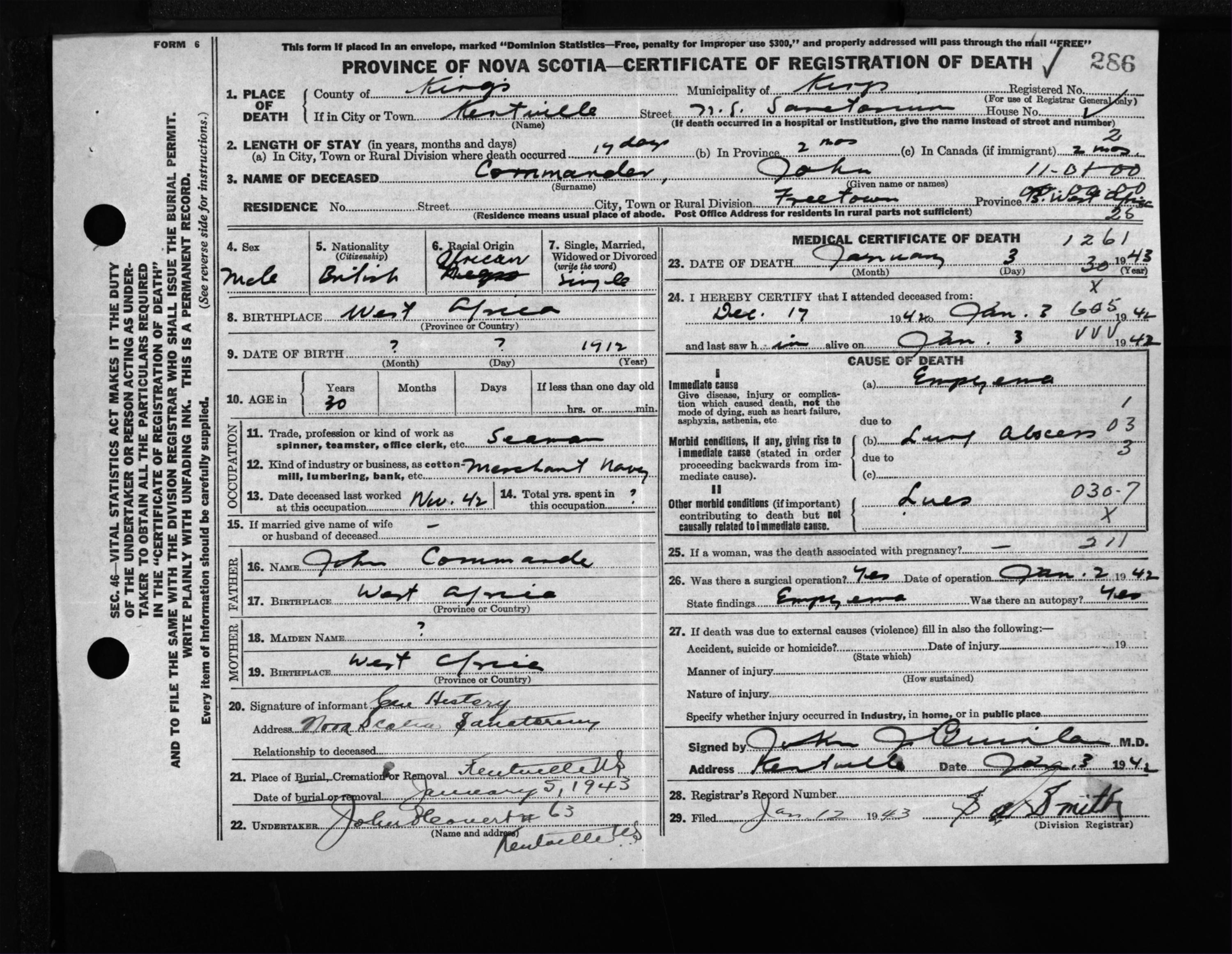 Male Death Registration: Year: 1943 file: 208 number: 286