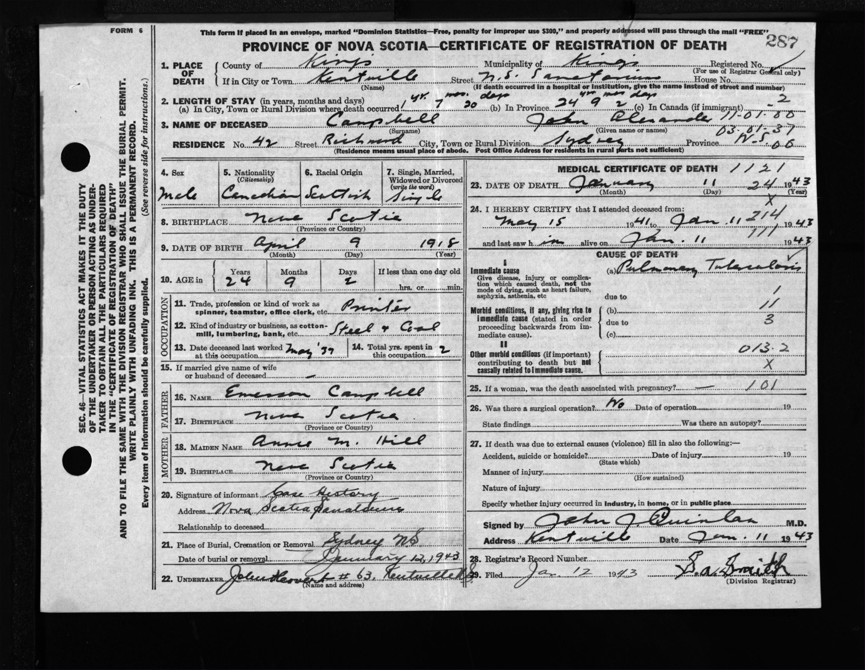 Male Death Registration: Year: 1943 file: 208 number: 287