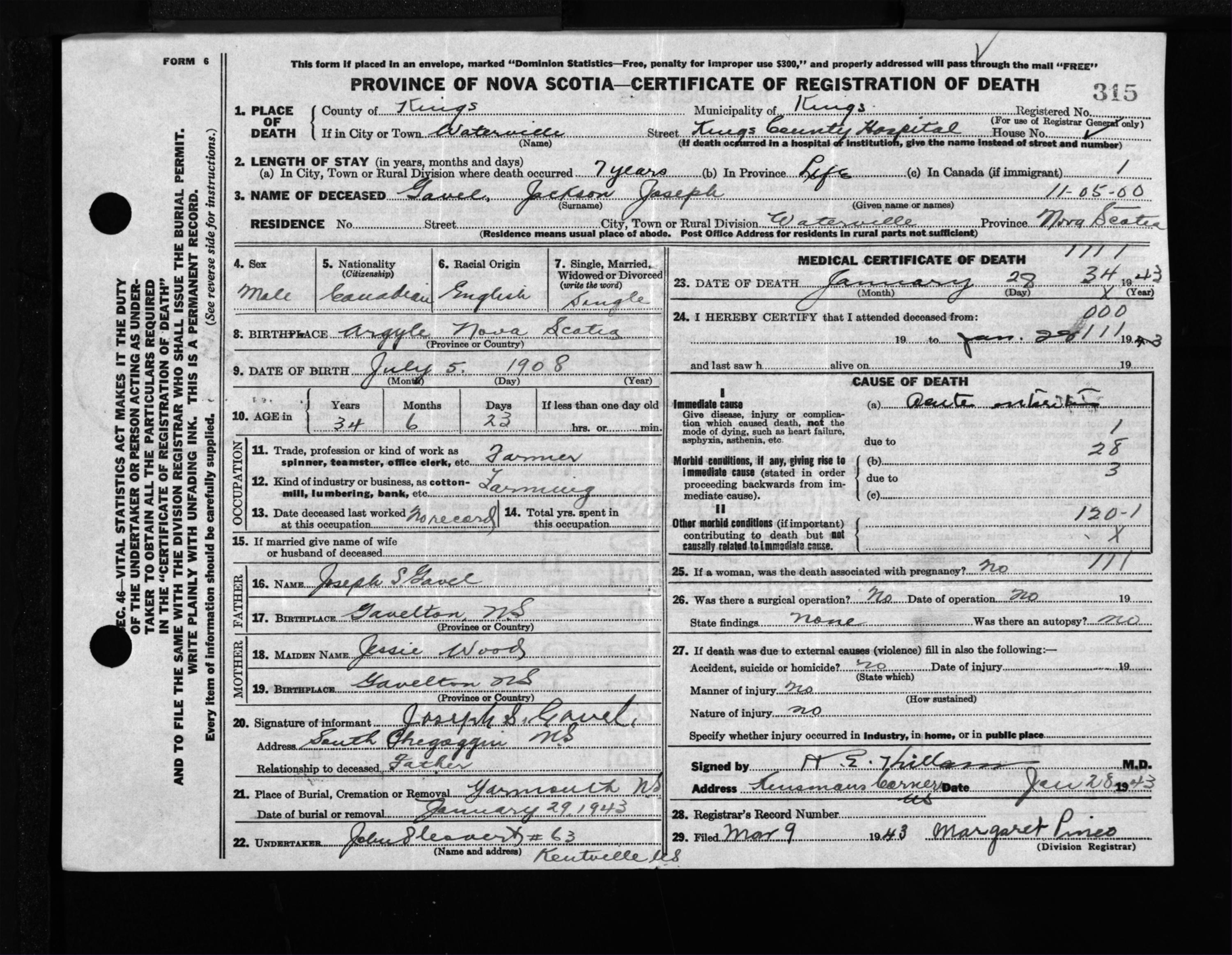 Male Death Registration: Year: 1943 file: 208 number: 315