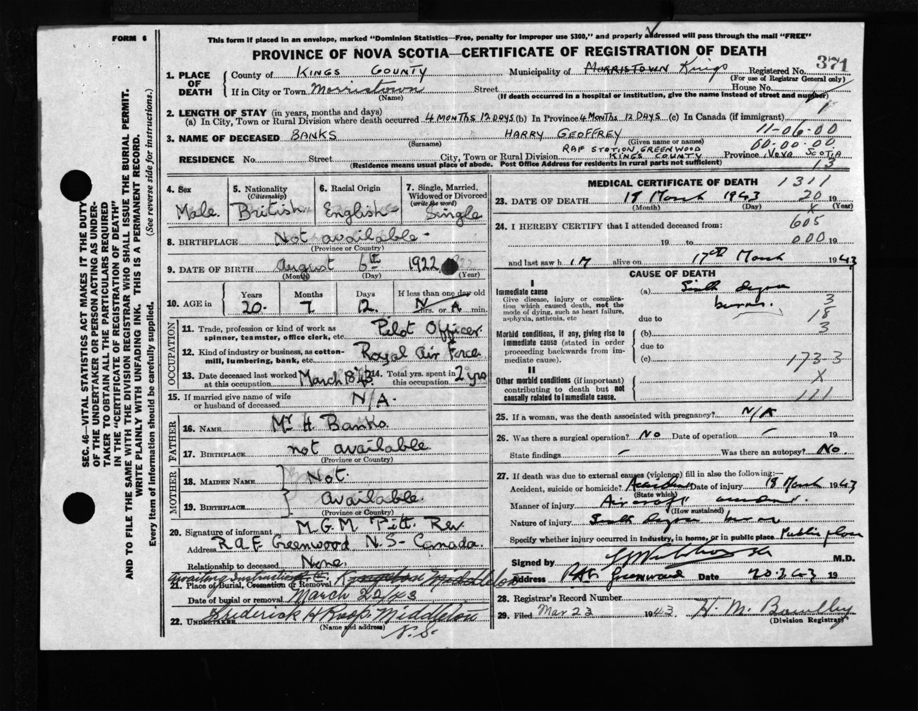Male Death Registration: Year: 1943 file: 208 number: 371