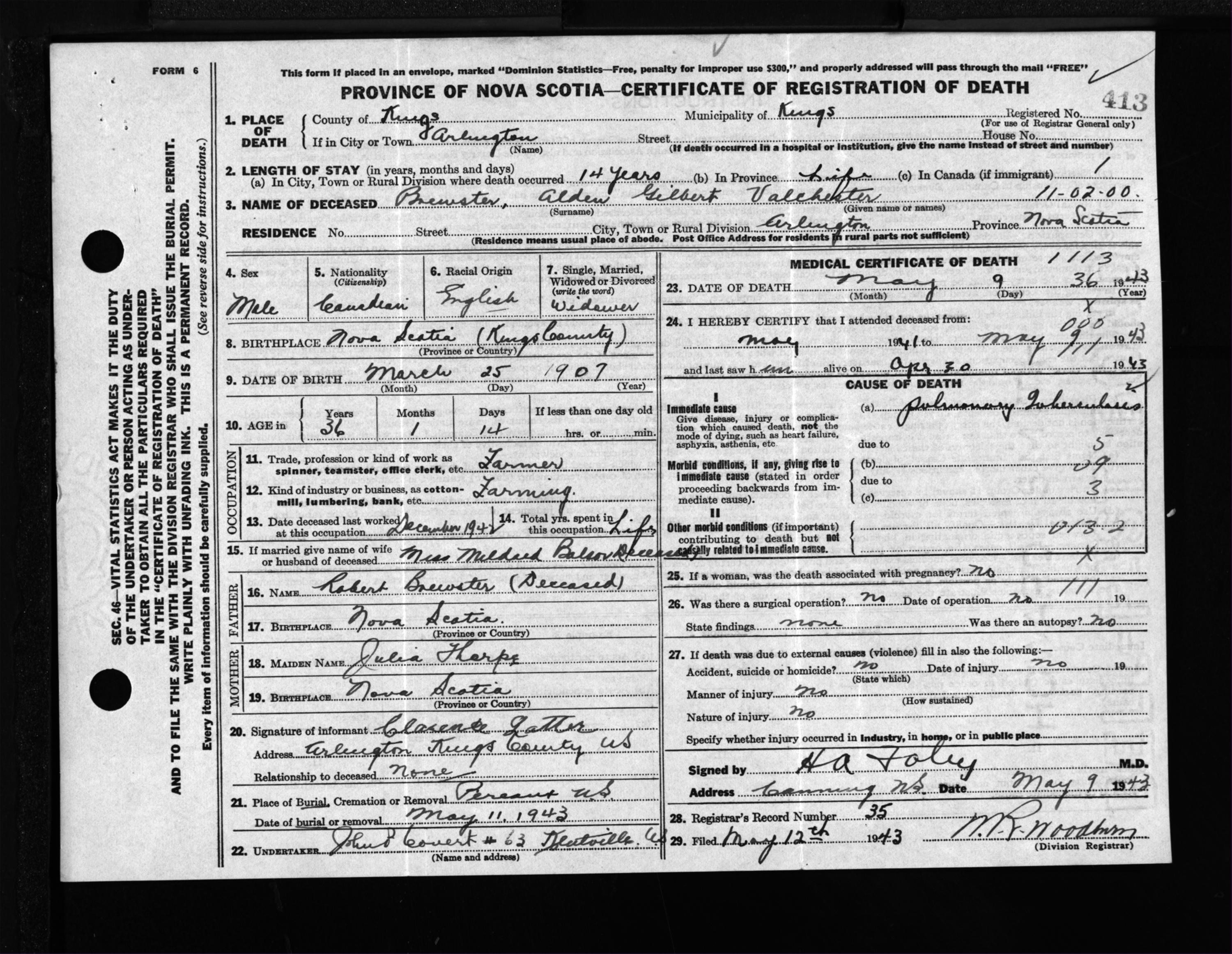 Male Death Registration: Year: 1943 file: 208 number: 413
