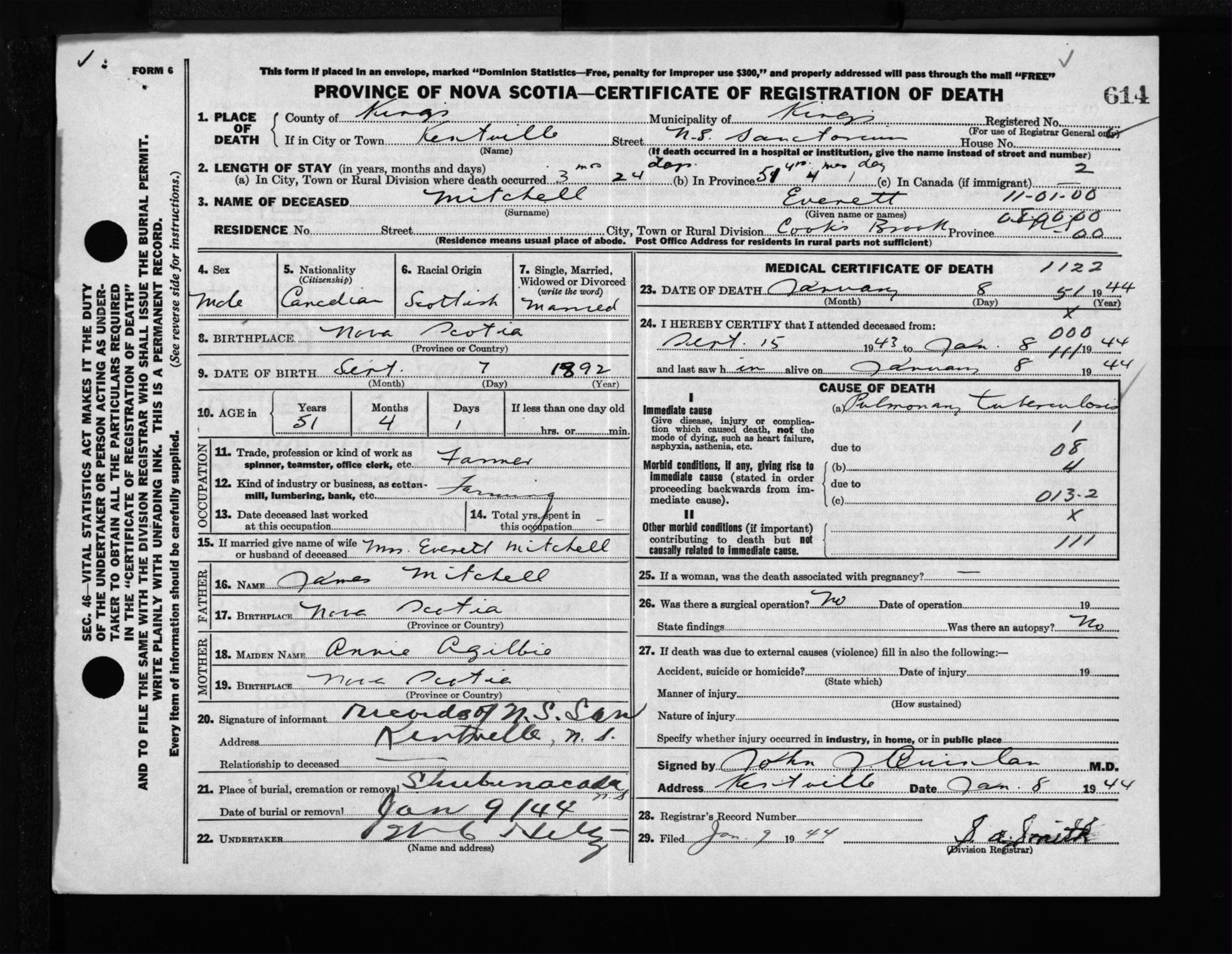 Male Death Registration: Year: 1944 file: 208 number: 614