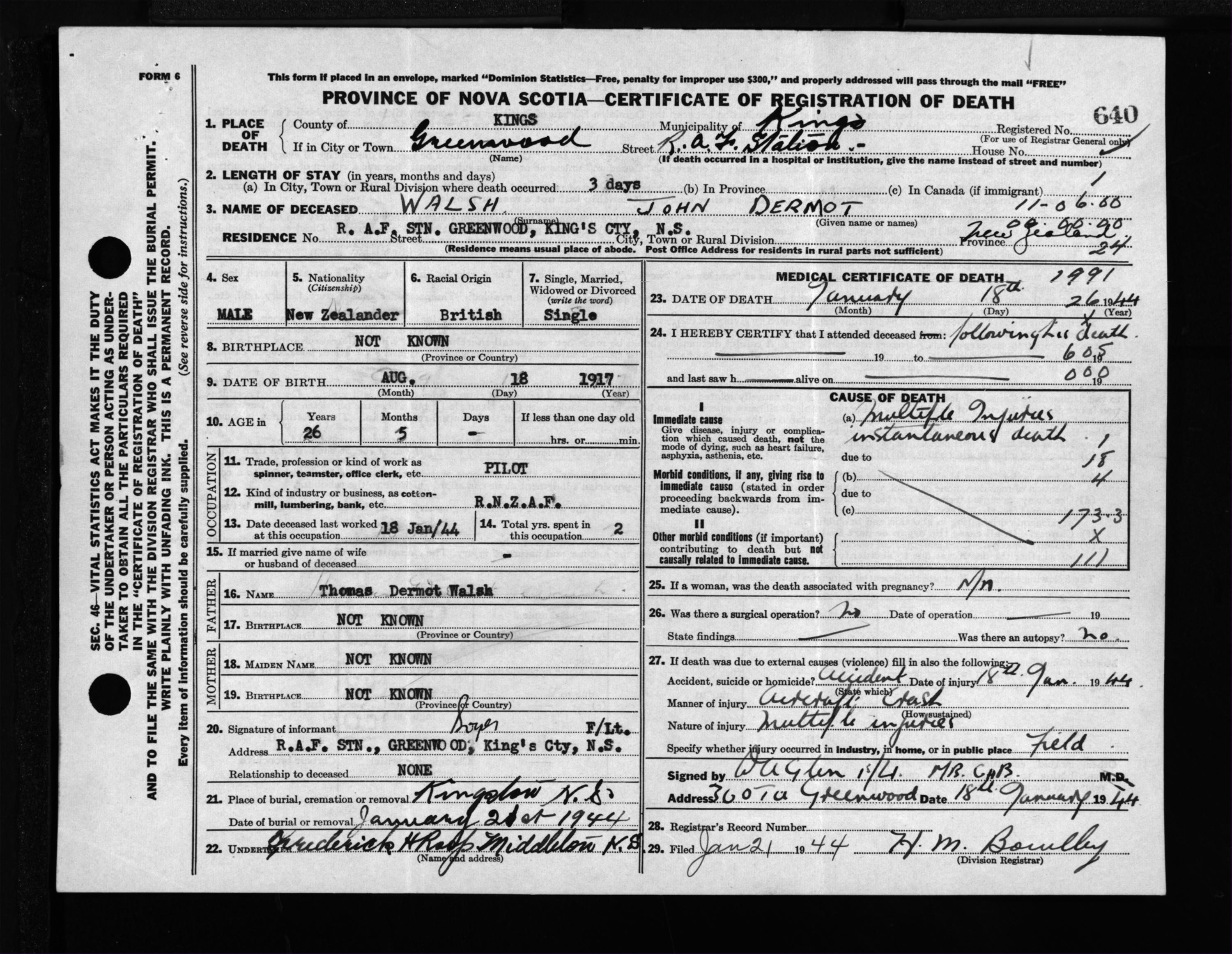 Male Death Registration: Year: 1944 file: 208 number: 640