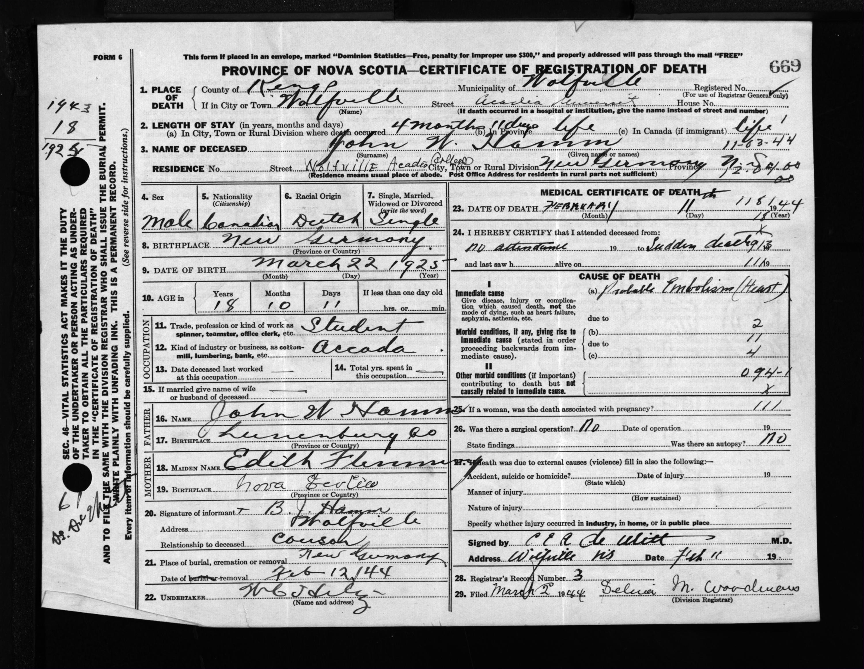 Male Death Registration: Year: 1944 file: 208 number: 669
