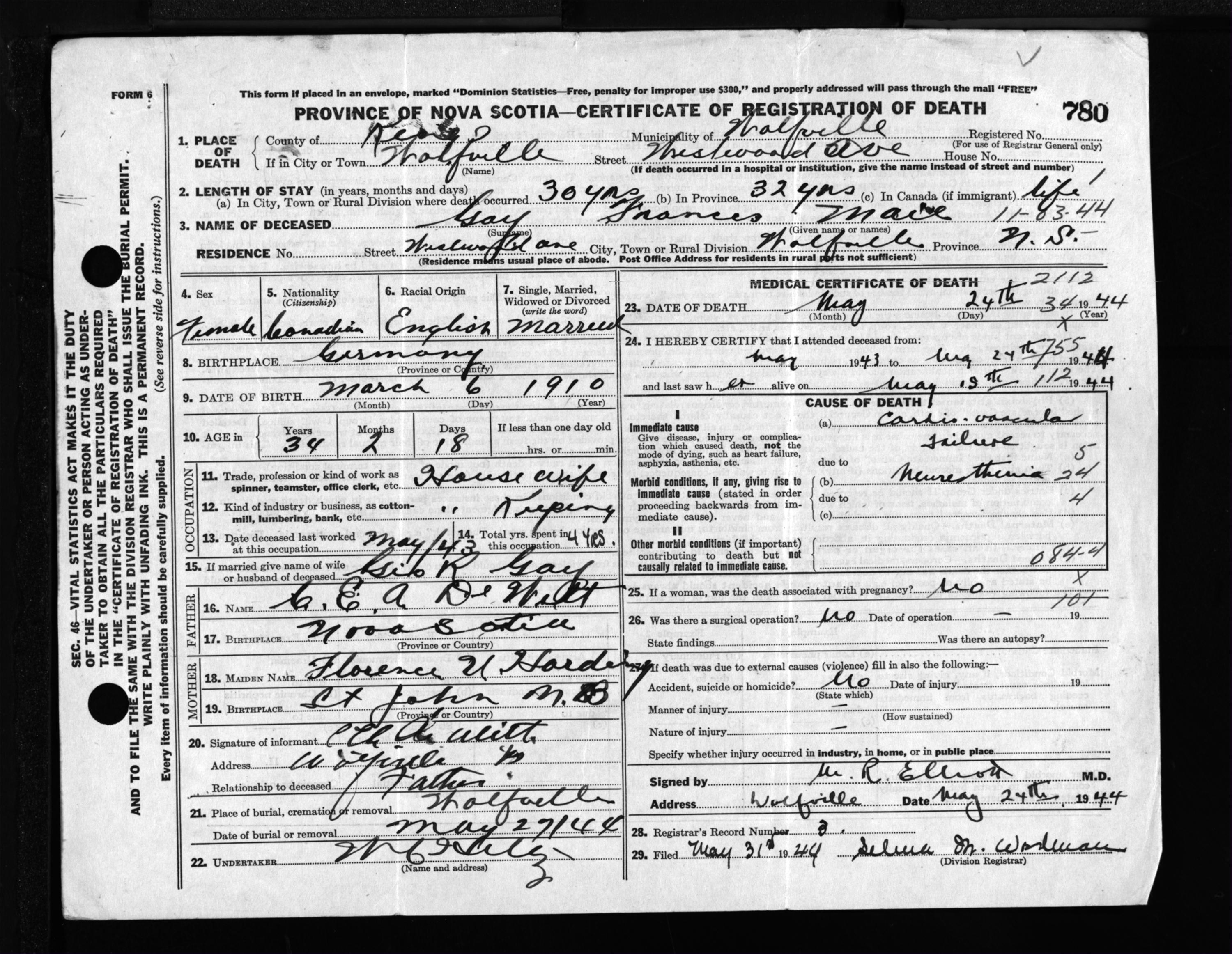 Female Death Registration: Year: 1944 file: 208 number: 780