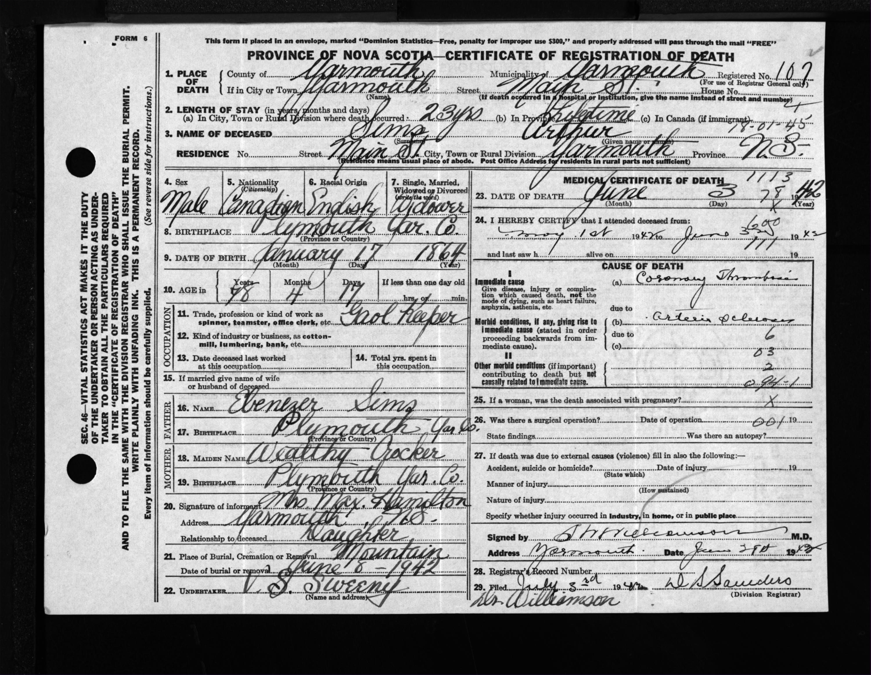 Male Death Registration: Year: 1942 file: 209 number: 107