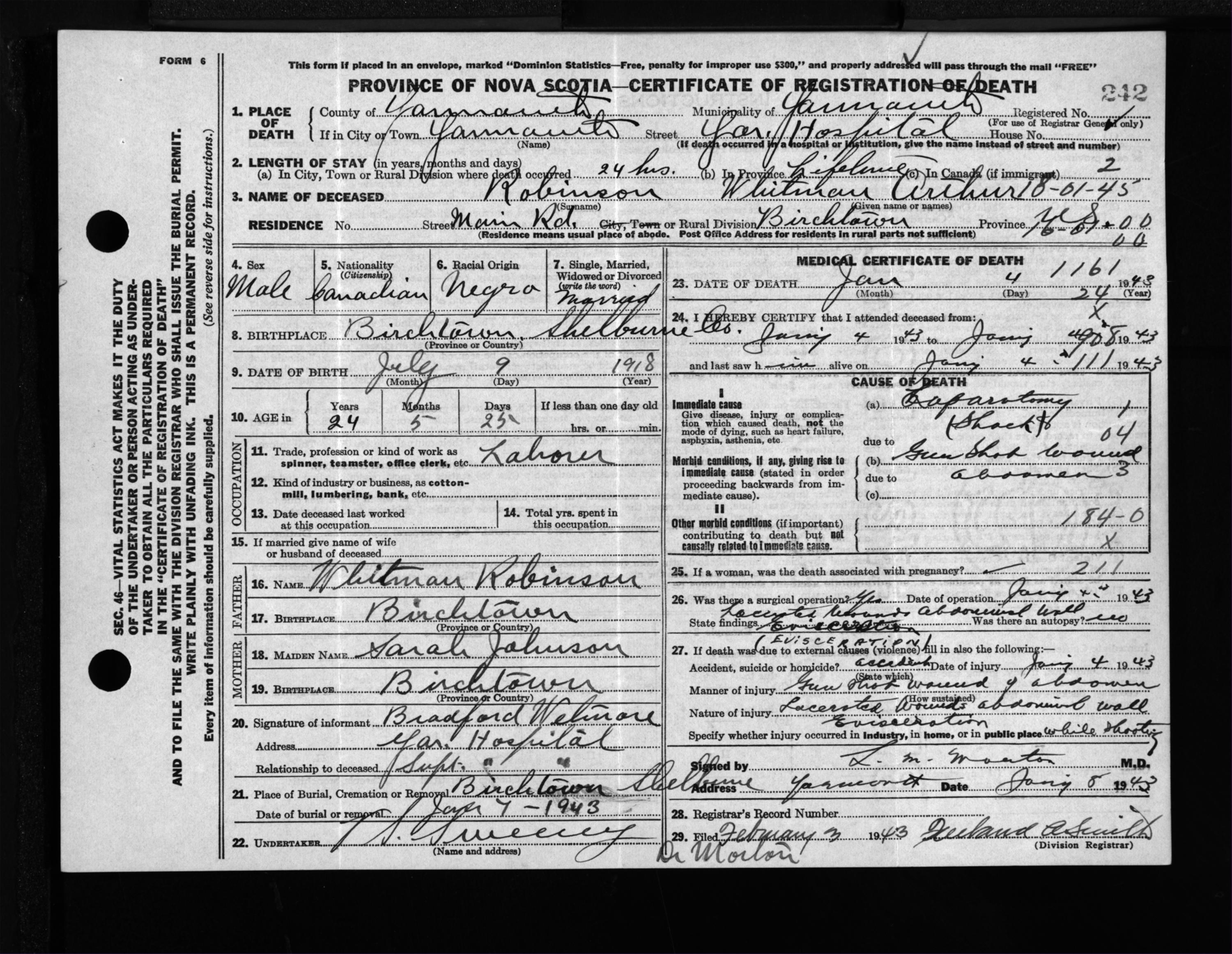 Male Death Registration: Year: 1943 file: 209 number: 242