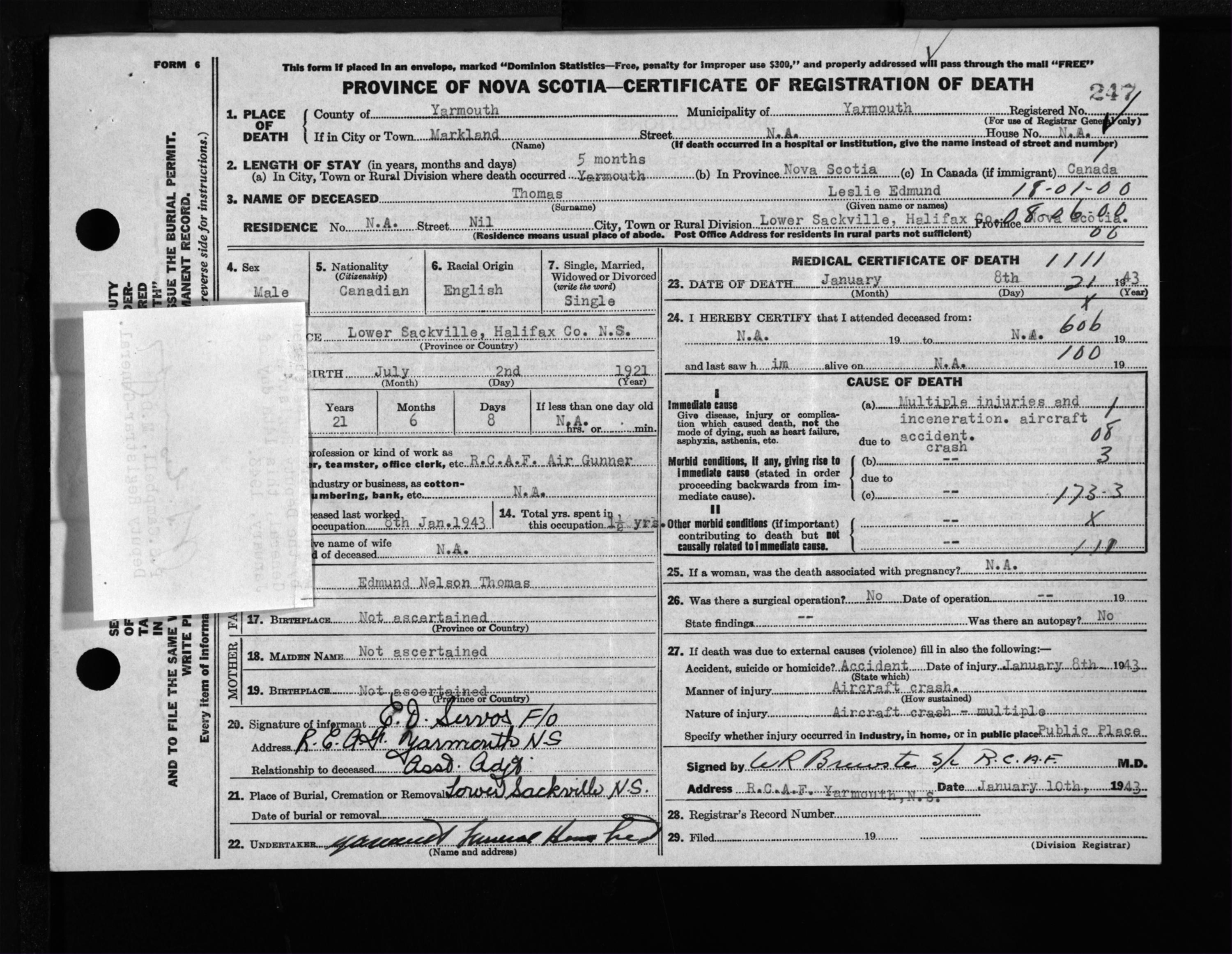 Male Death Registration: Year: 1943 file: 209 number: 247