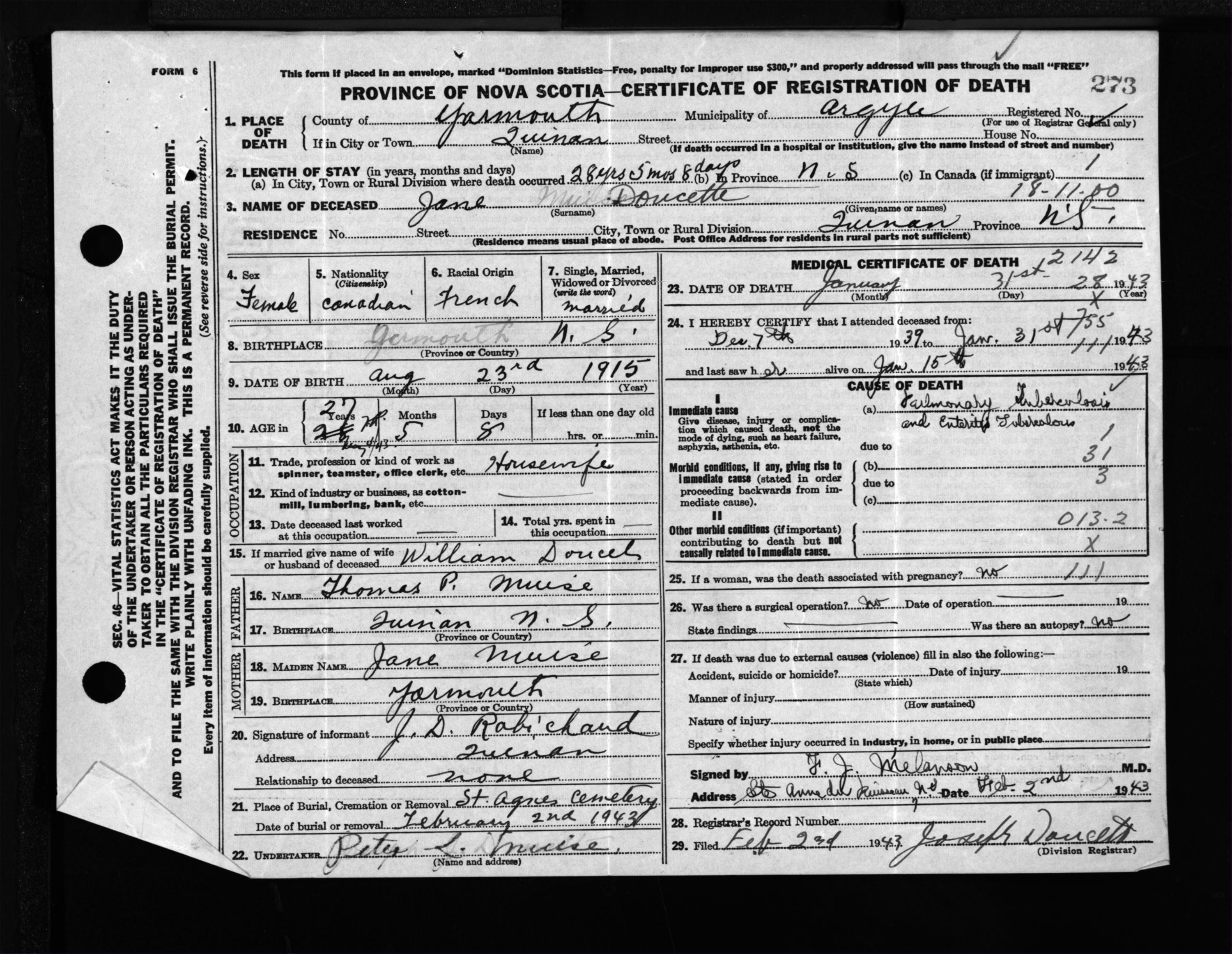 Female Death Registration: Year: 1943 file: 209 number: 273