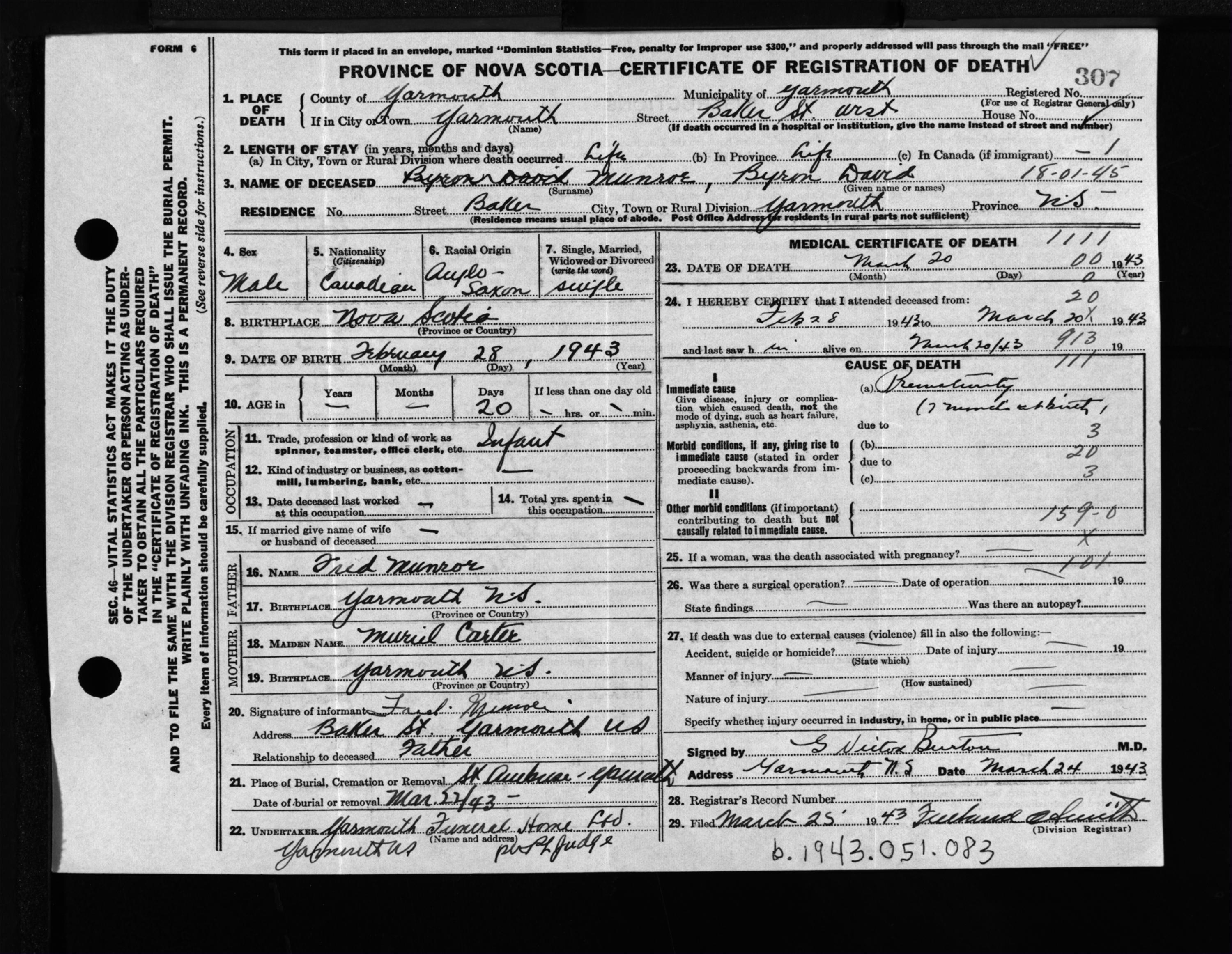 Male Death Registration: Year: 1943 file: 209 number: 307