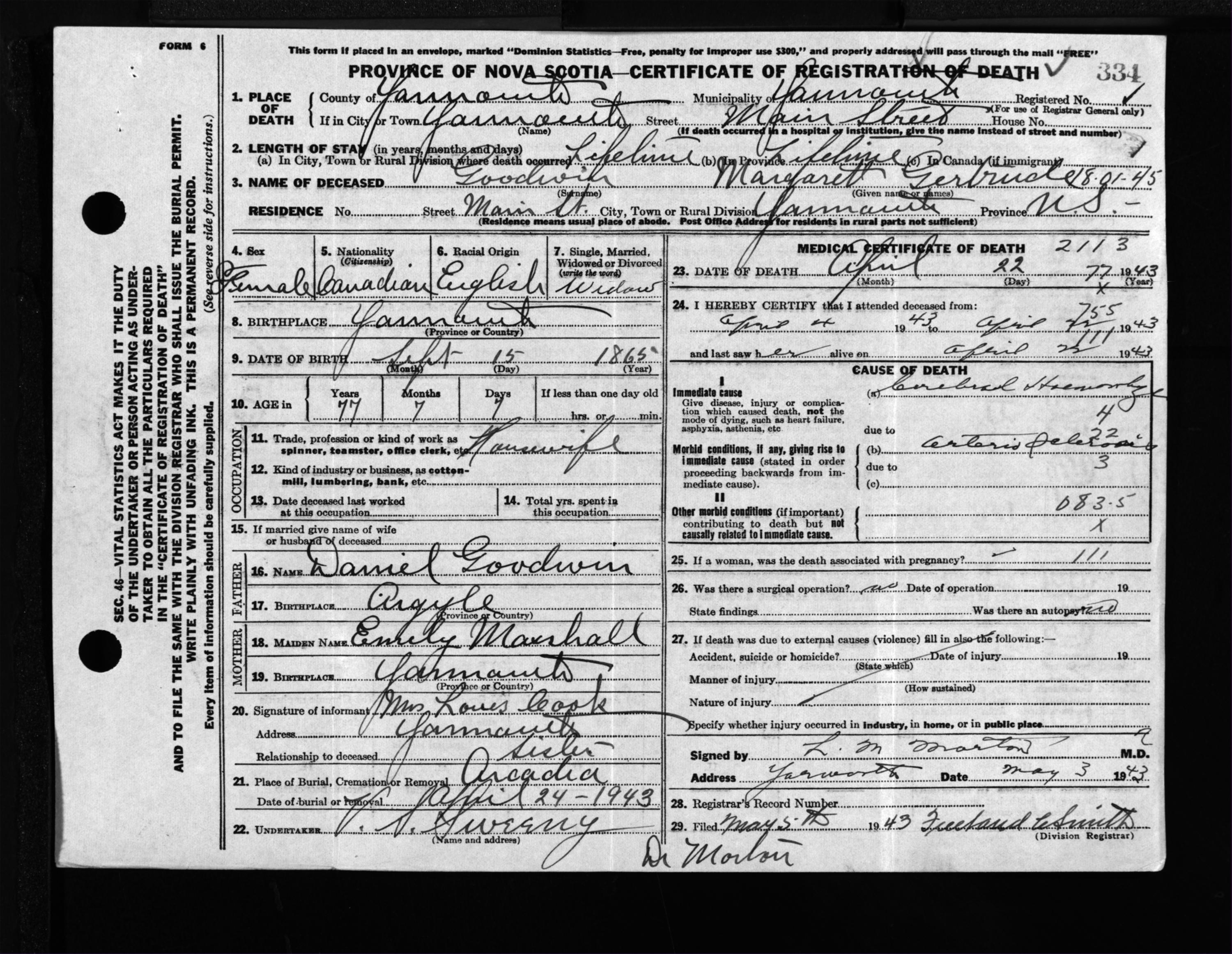 Female Death Registration: Year: 1943 file: 209 number: 334