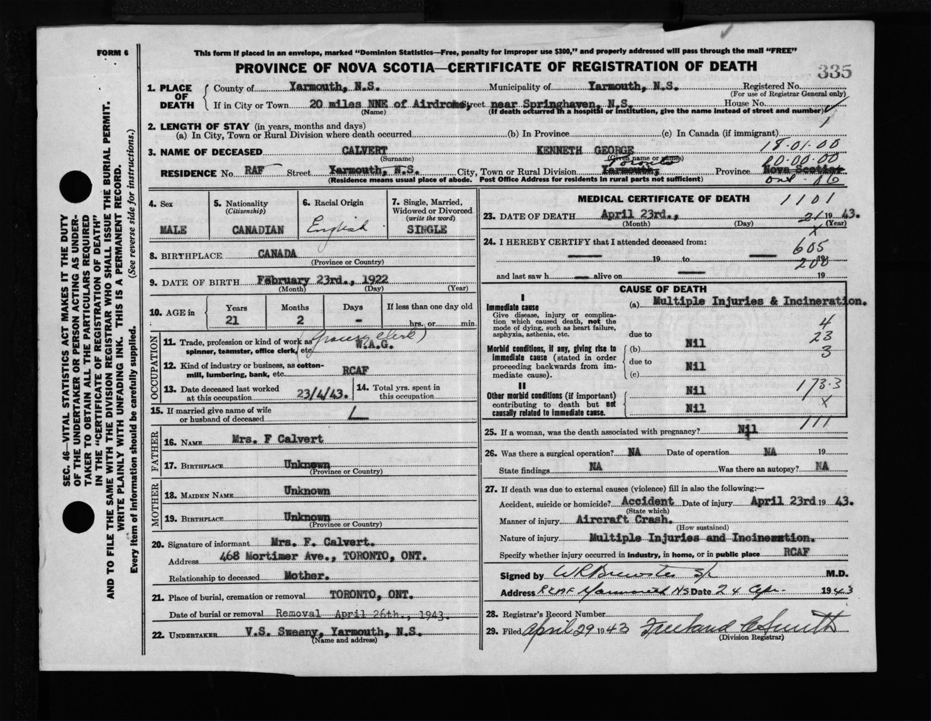 Male Death Registration: Year: 1943 file: 209 number: 335