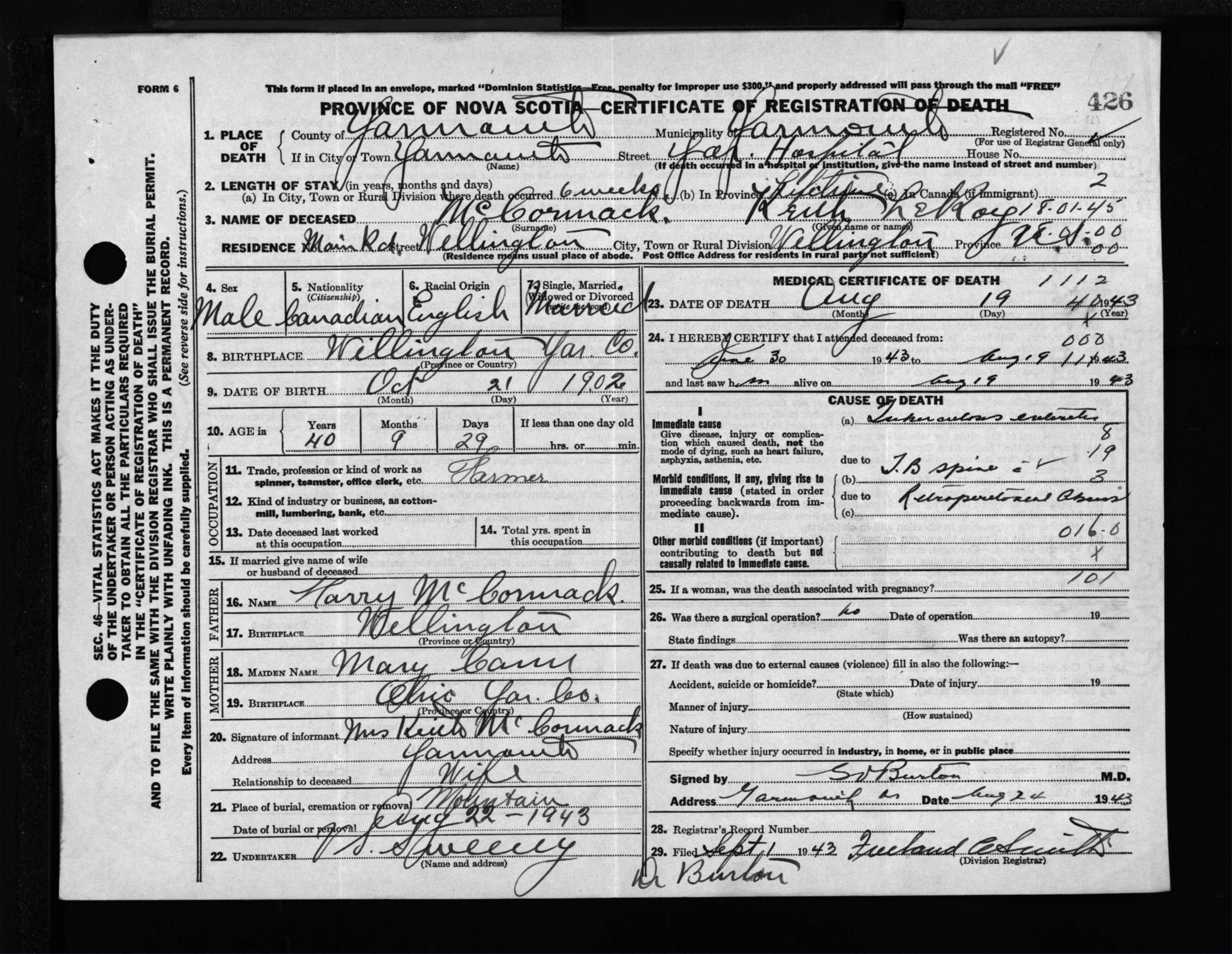 Male Death Registration: Year: 1943 file: 209 number: 426