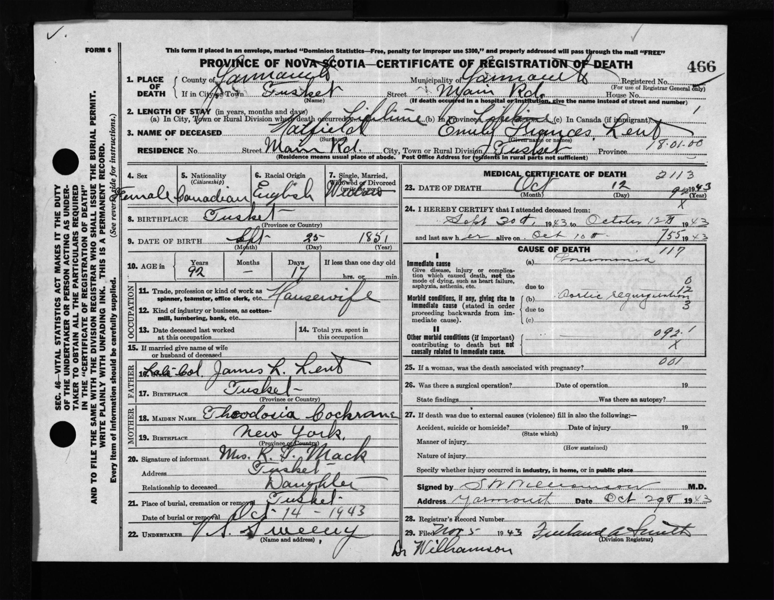 Female Death Registration: Year: 1943 file: 209 number: 466