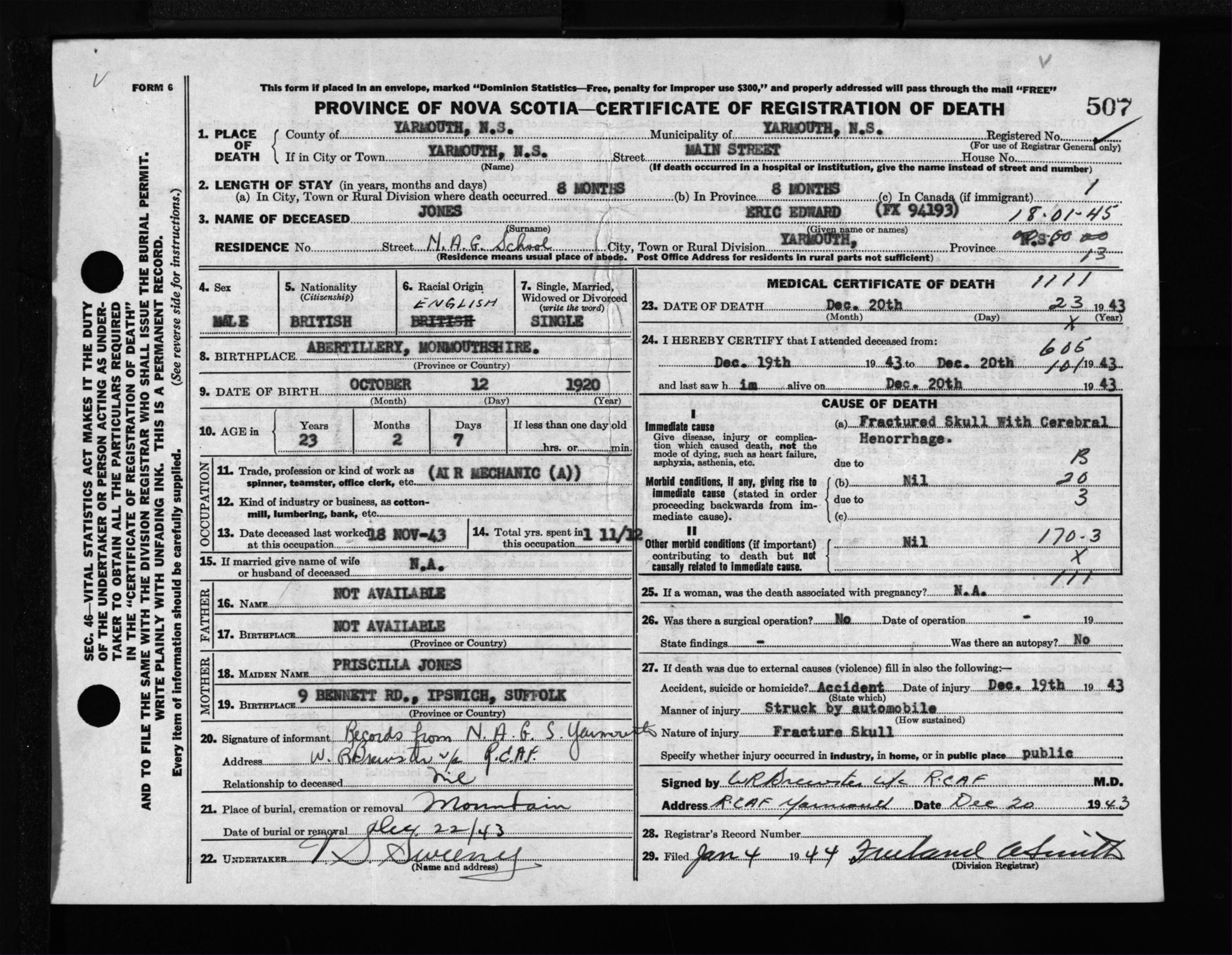 Male Death Registration: Year: 1943 file: 209 number: 507