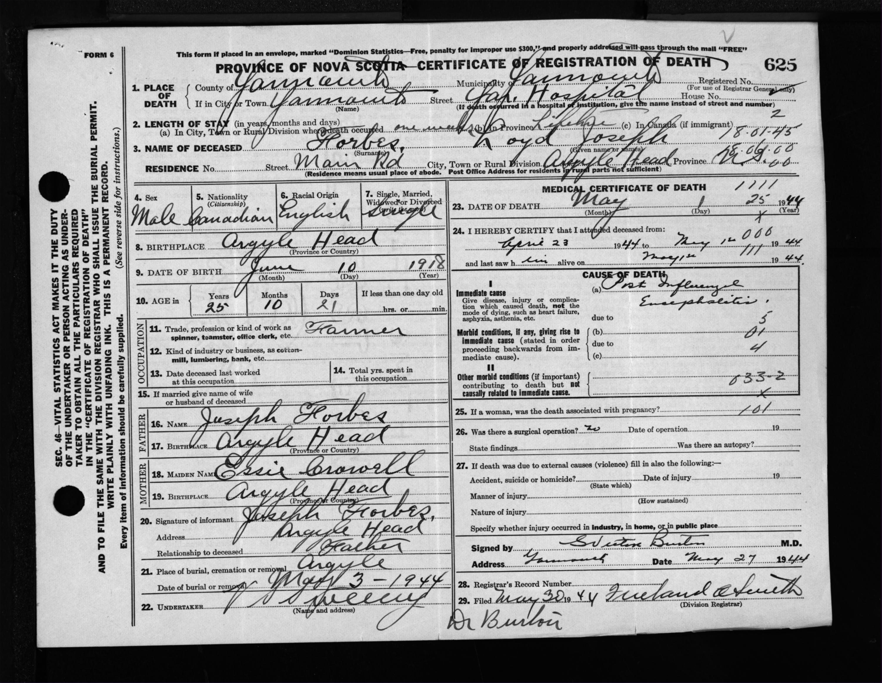 Male Death Registration: Year: 1944 file: 209 number: 625