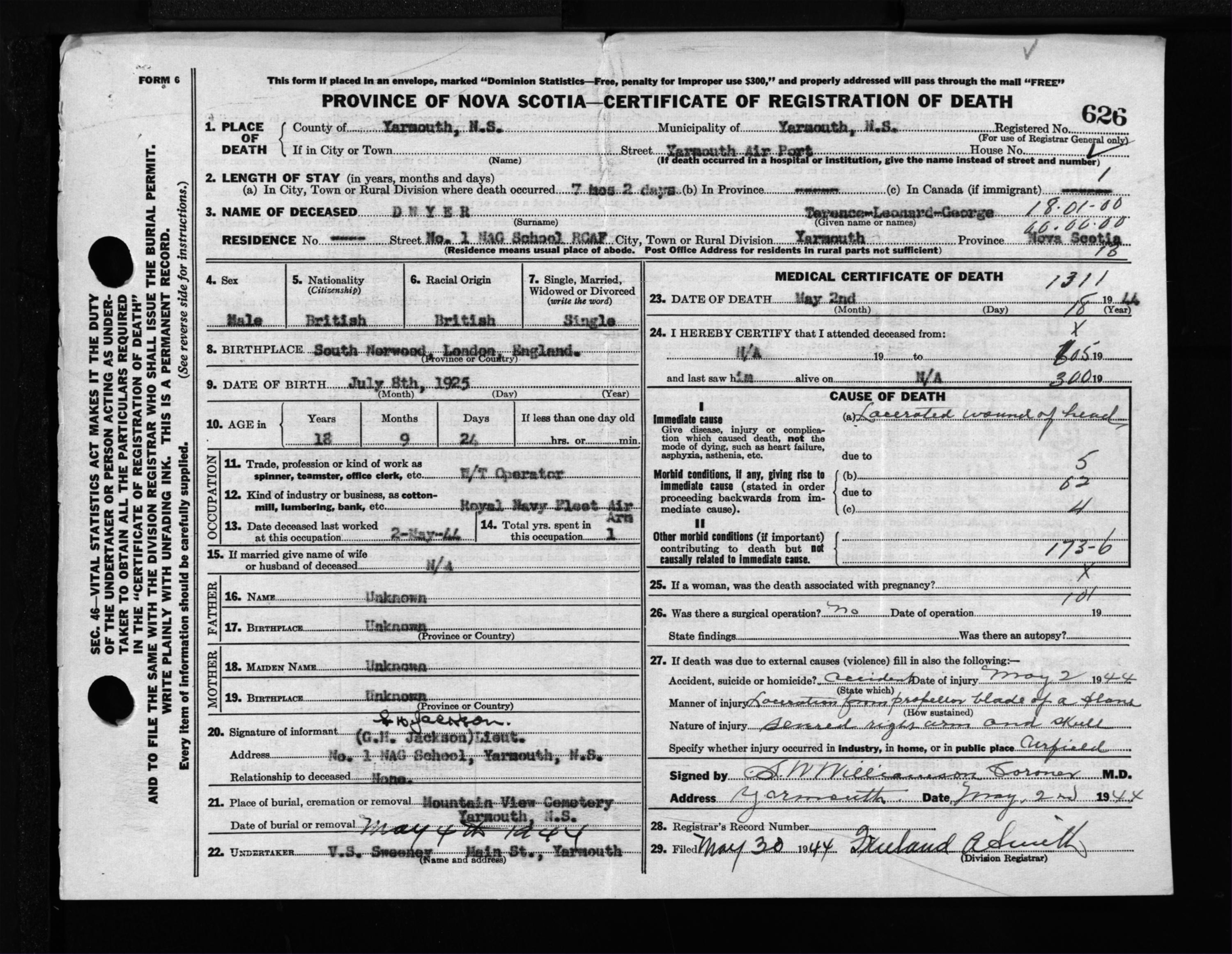 Male Death Registration: Year: 1944 file: 209 number: 626