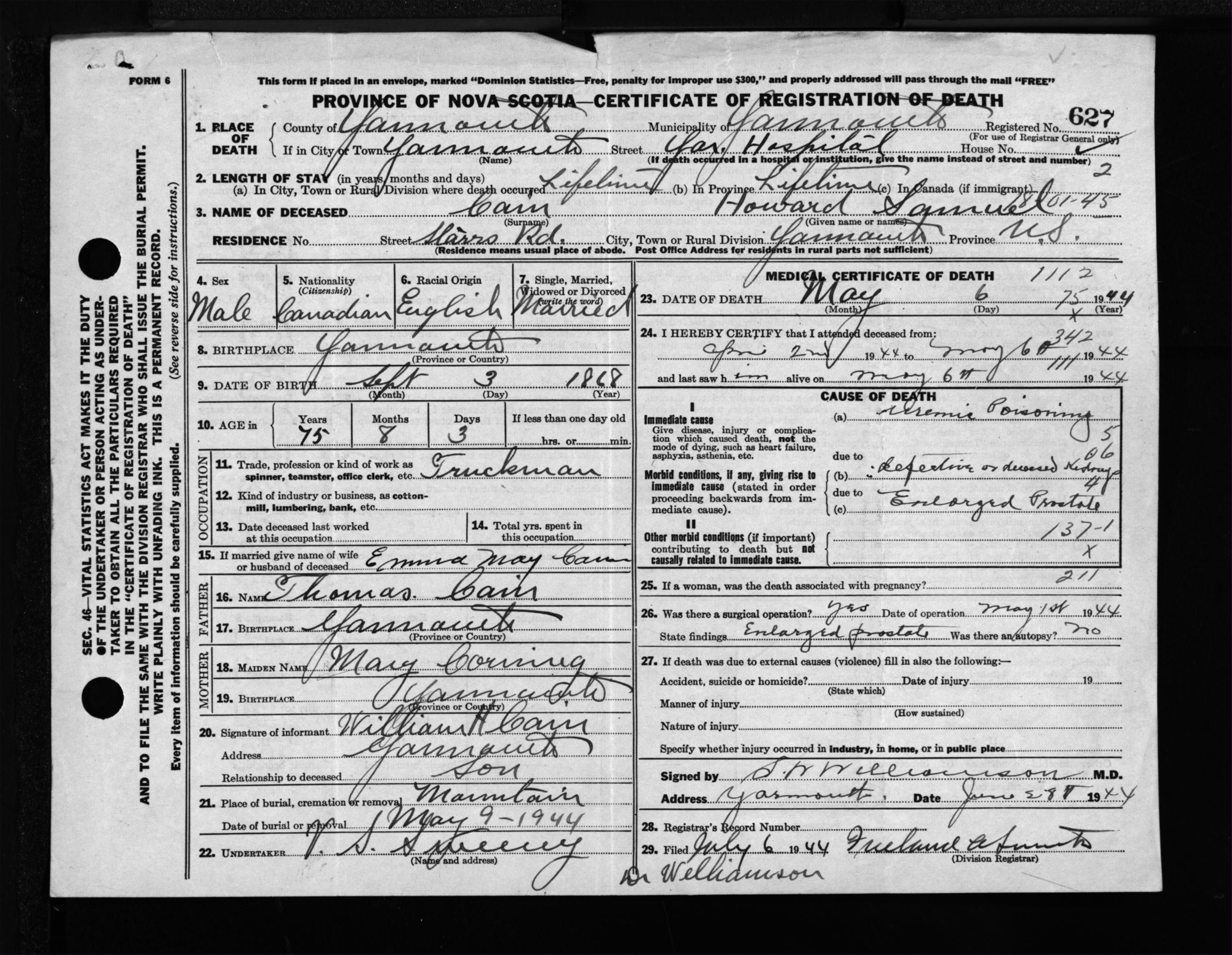 Male Death Registration: Year: 1944 file: 209 number: 627
