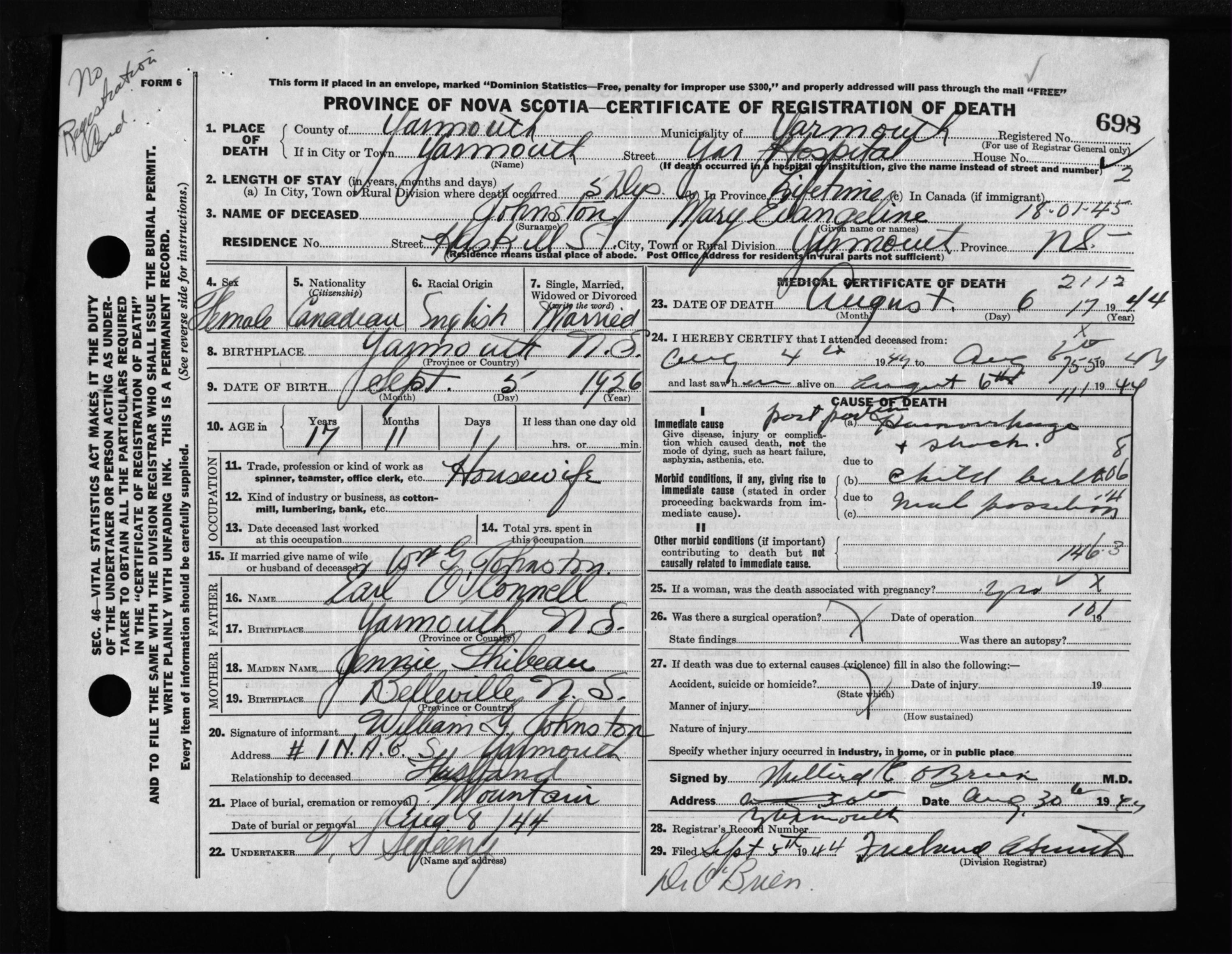 Female Death Registration: Year: 1944 file: 209 number: 698