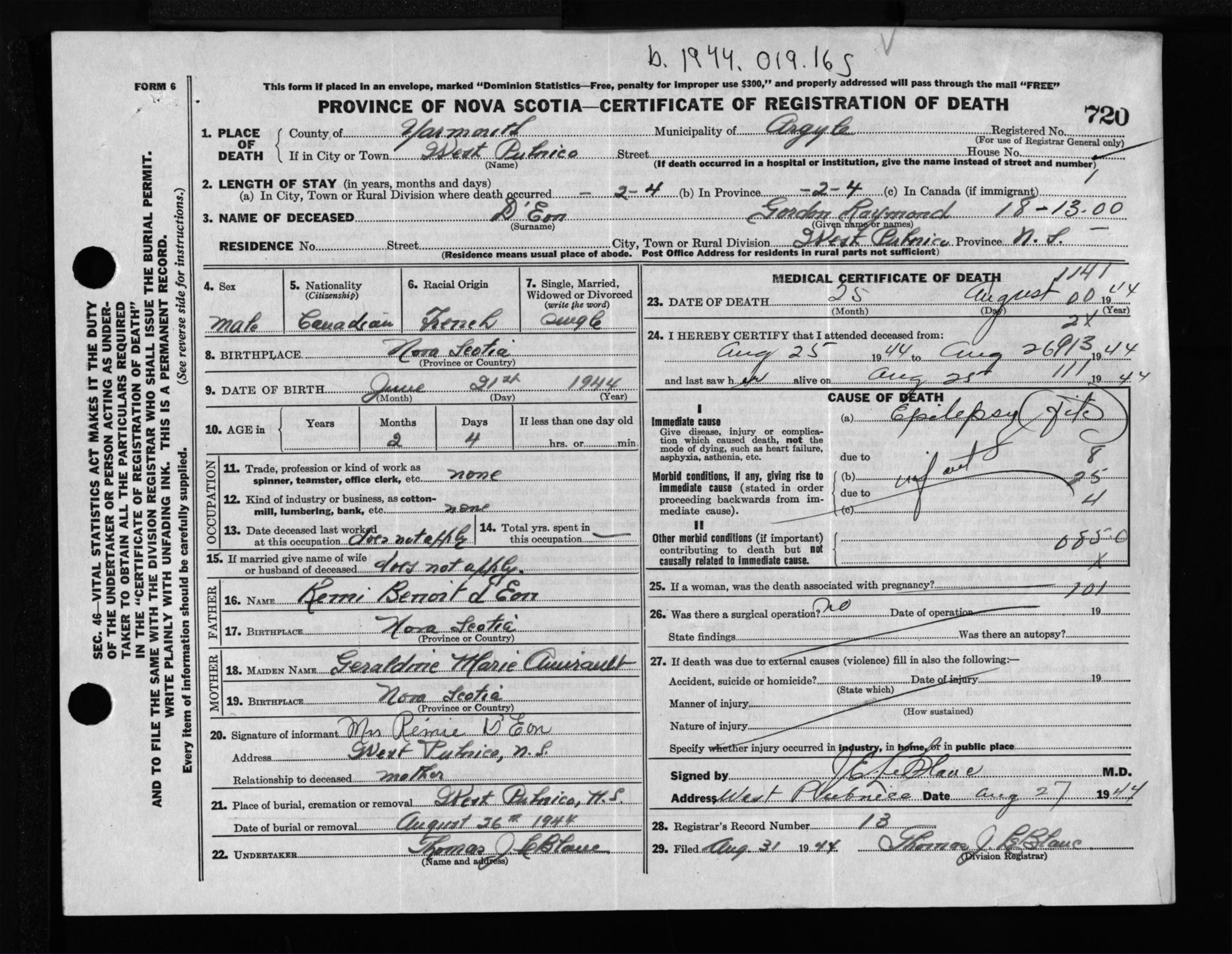 Male Death Registration: Year: 1944 file: 209 number: 720