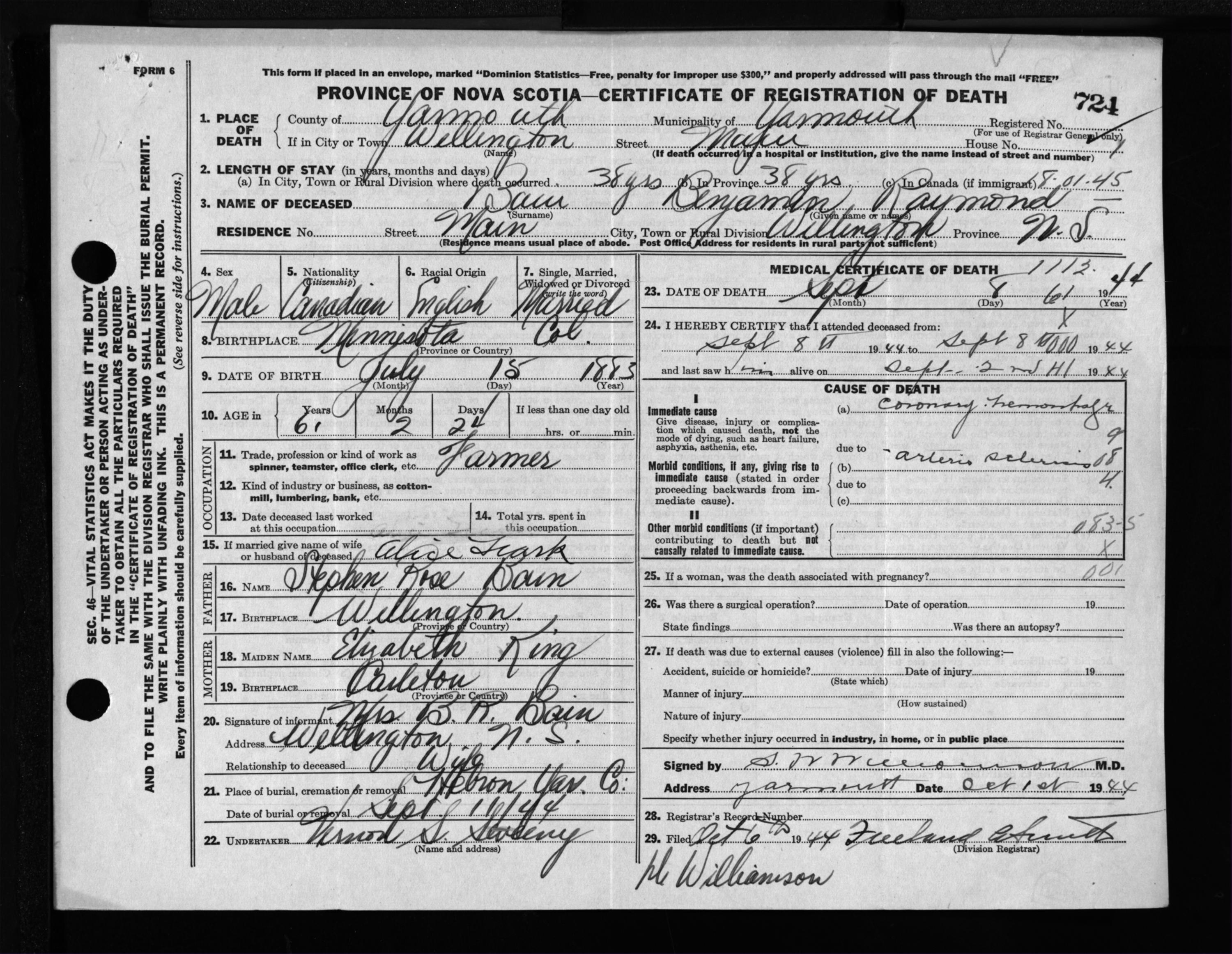 Male Death Registration: Year: 1944 file: 209 number: 724