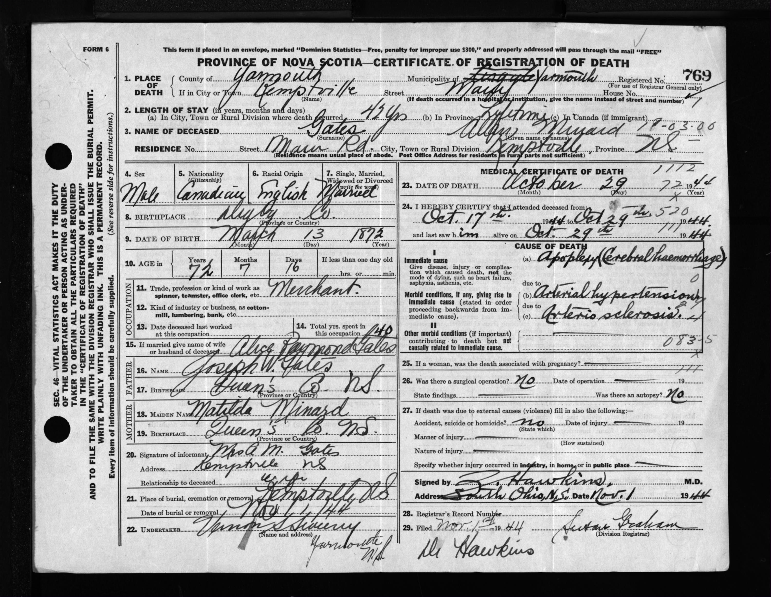 Male Death Registration: Year: 1944 file: 209 number: 769