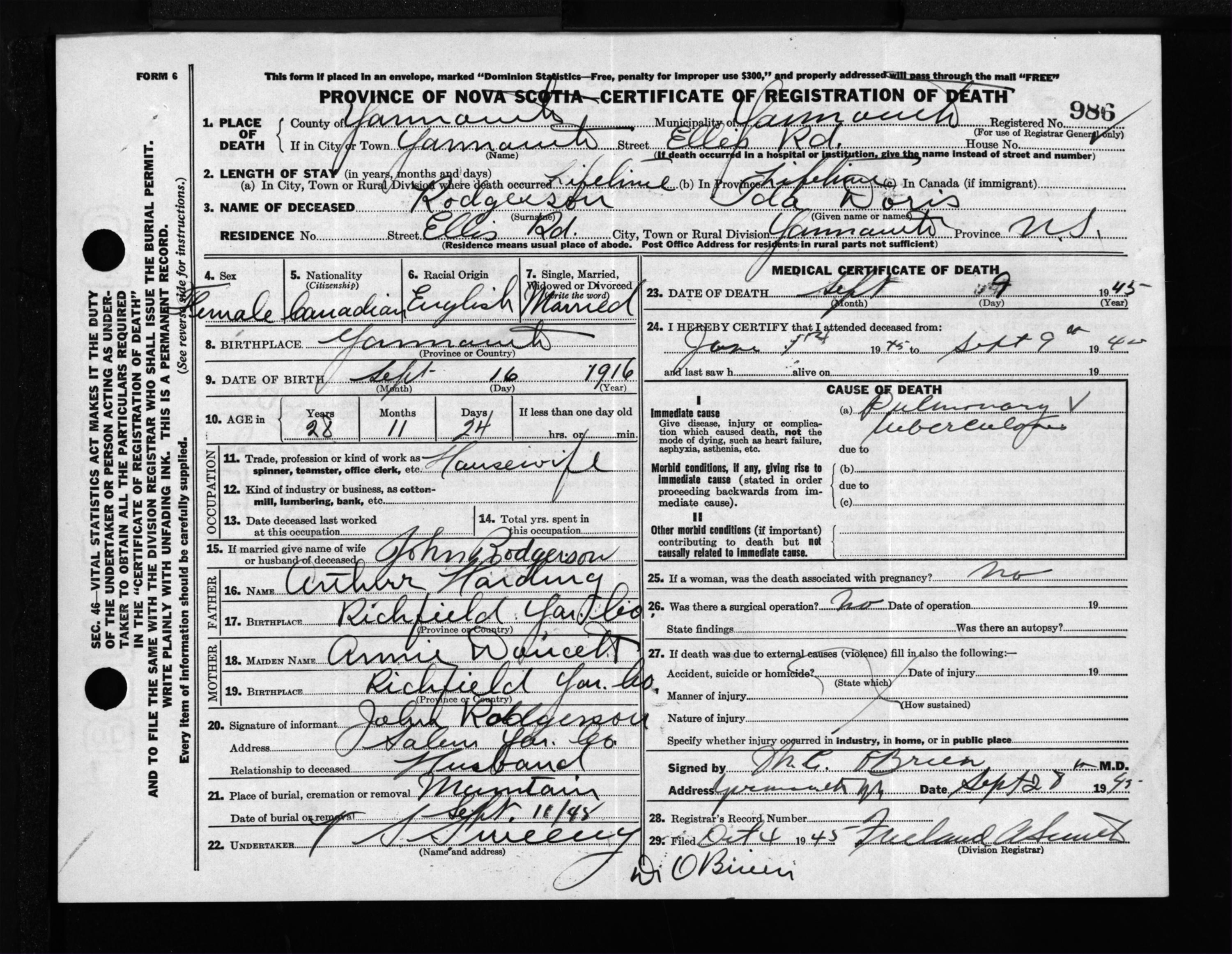 Female Death Registration: Year: 1945 file: 209 number: 986