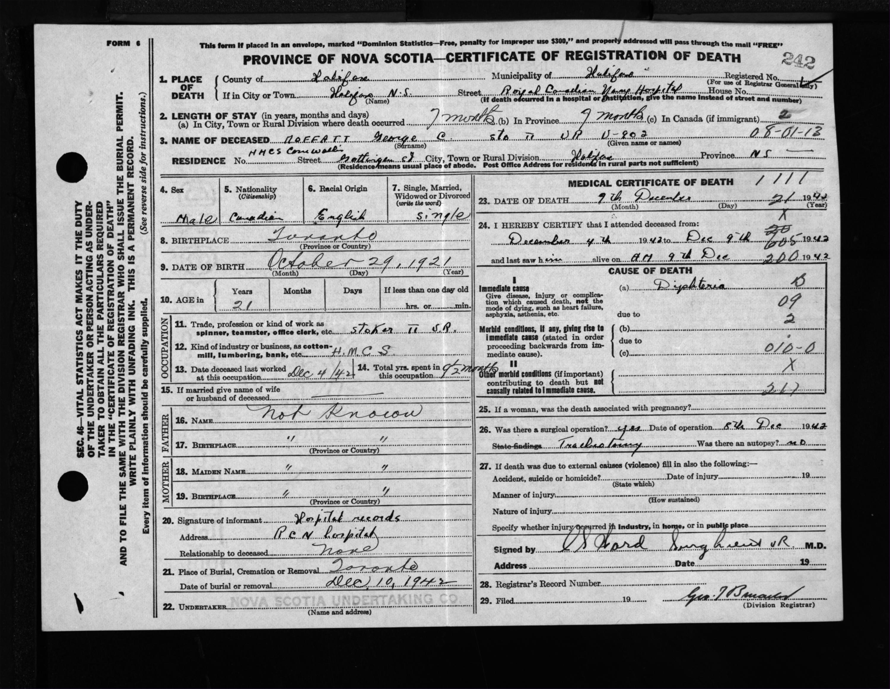 Male Death Registration: Year: 1942 file: 210 number: 242