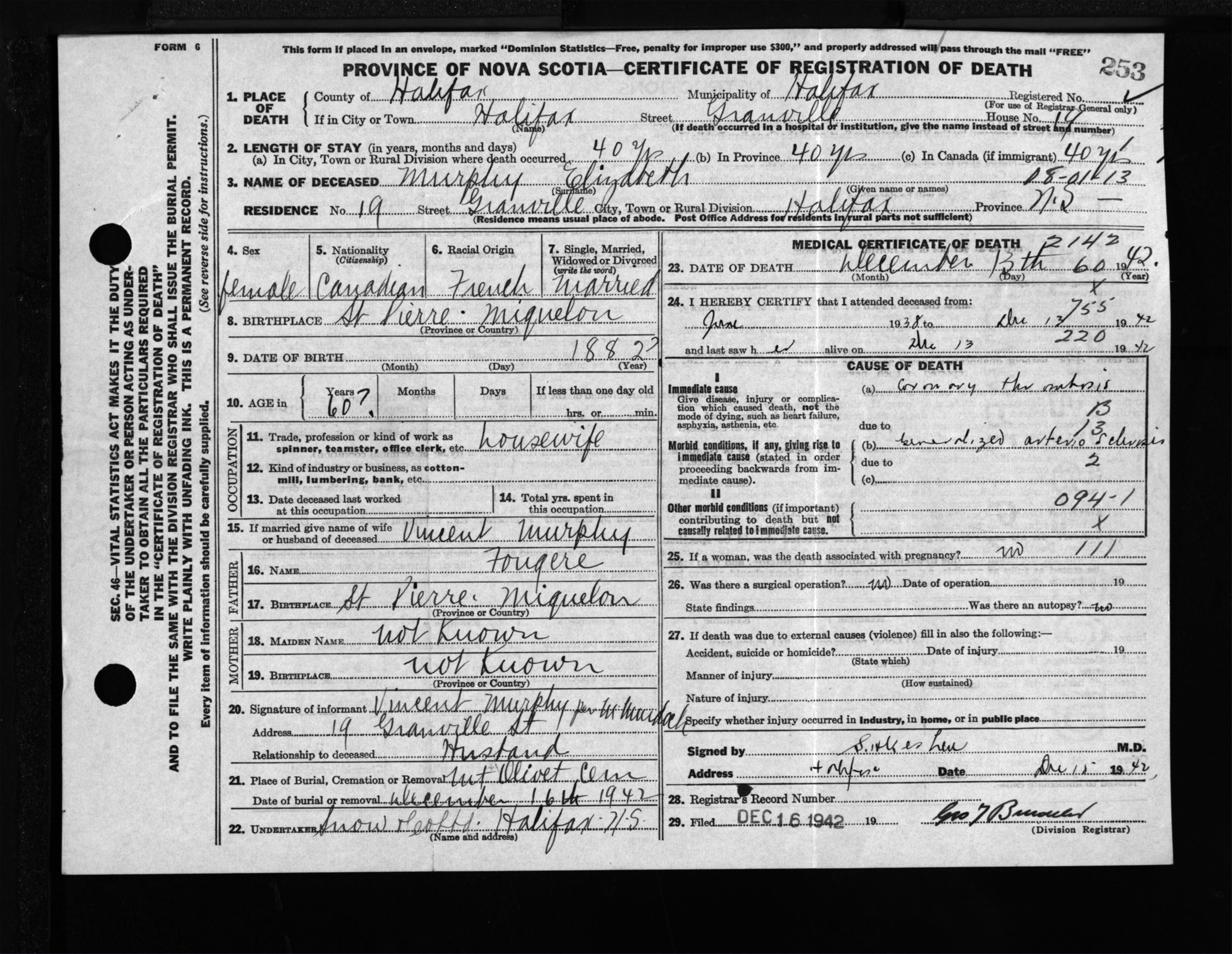 Female Death Registration: Year: 1942 file: 210 number: 253