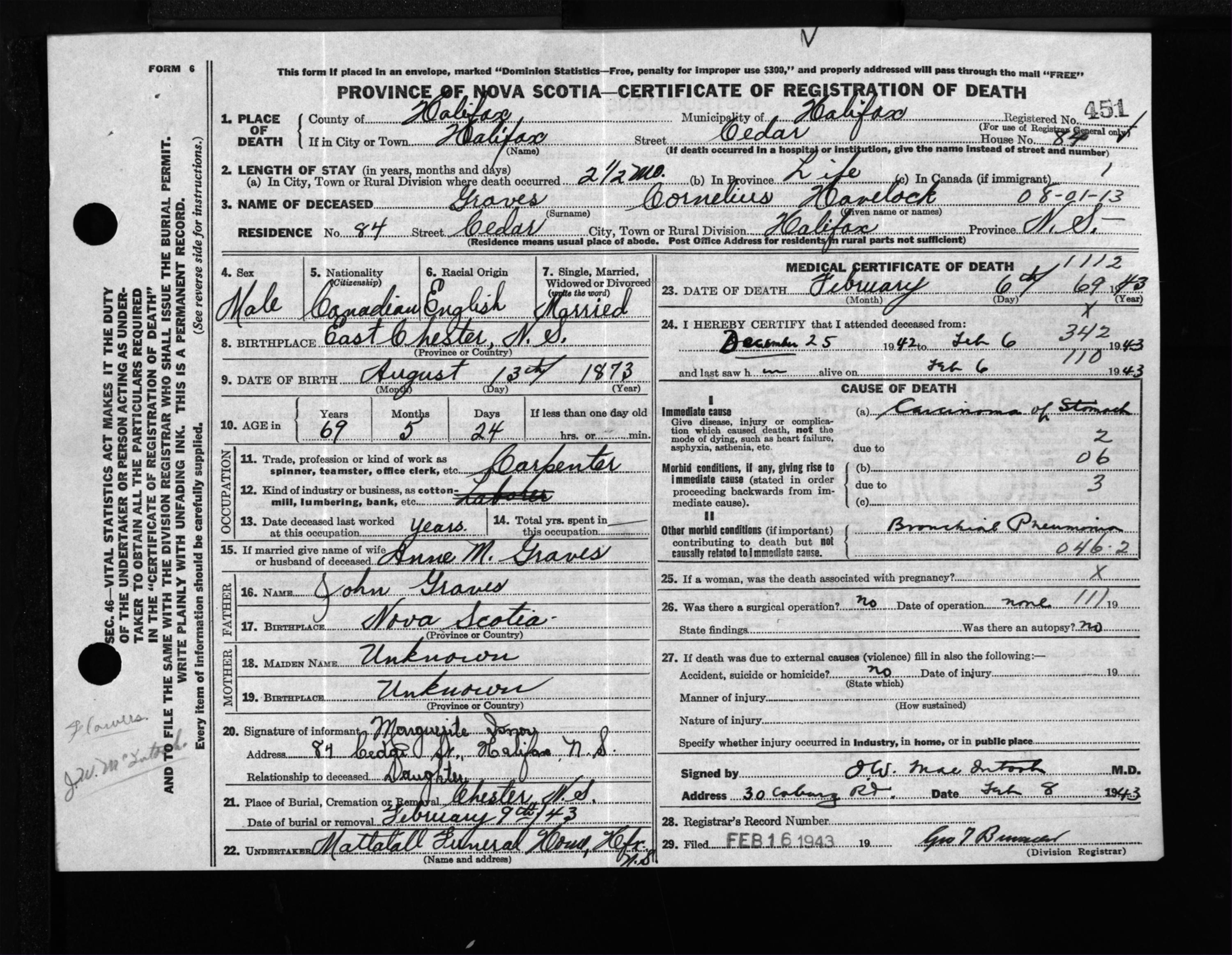 Male Death Registration: Year: 1943 file: 210 number: 451