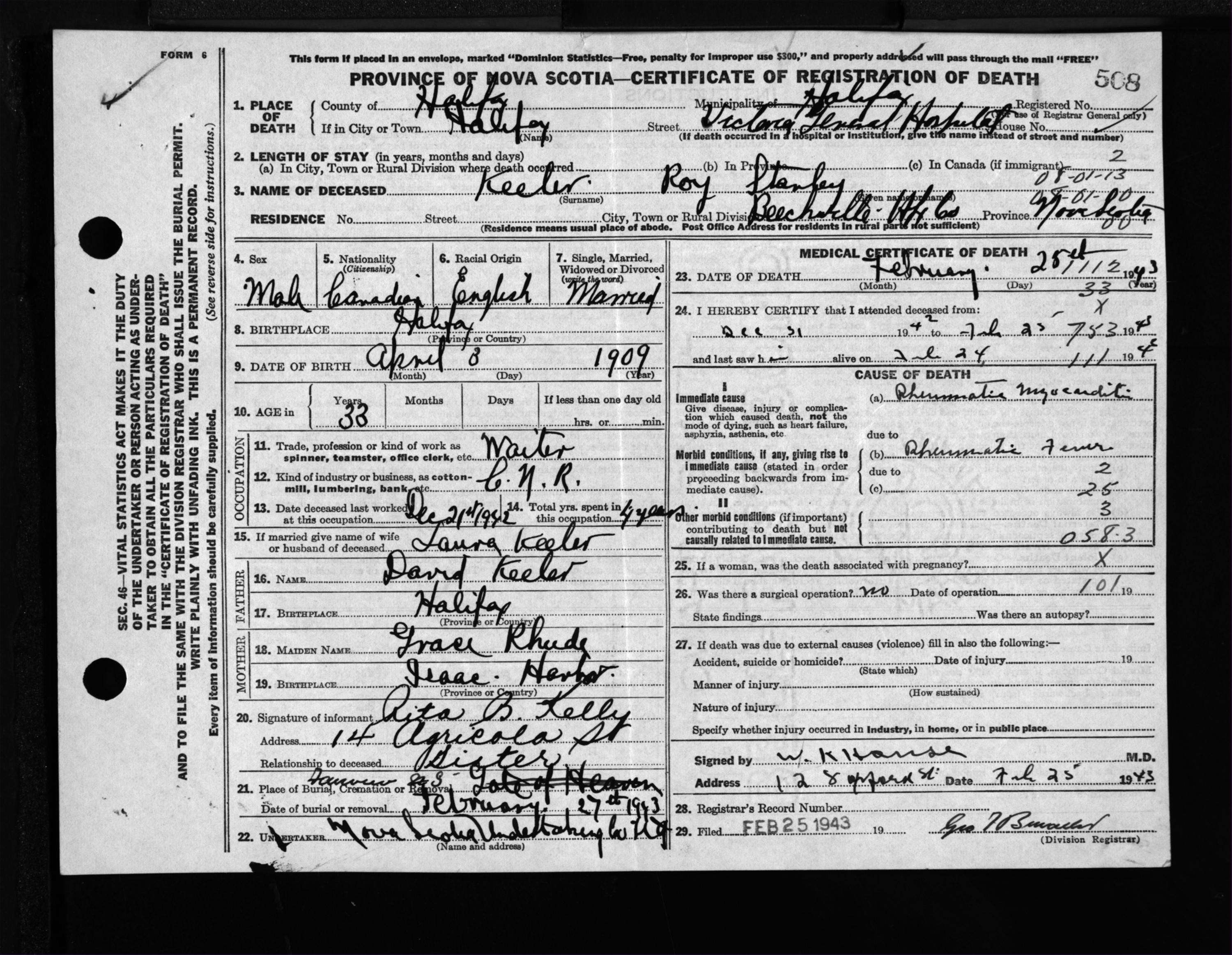 Male Death Registration: Year: 1943 file: 210 number: 508