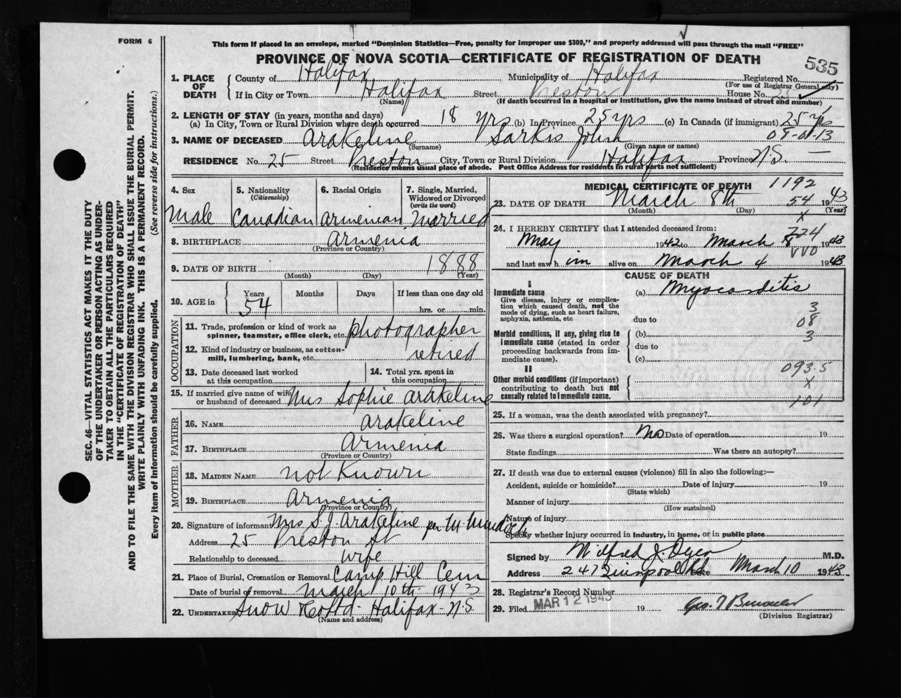 Male Death Registration: Year: 1943 file: 210 number: 535