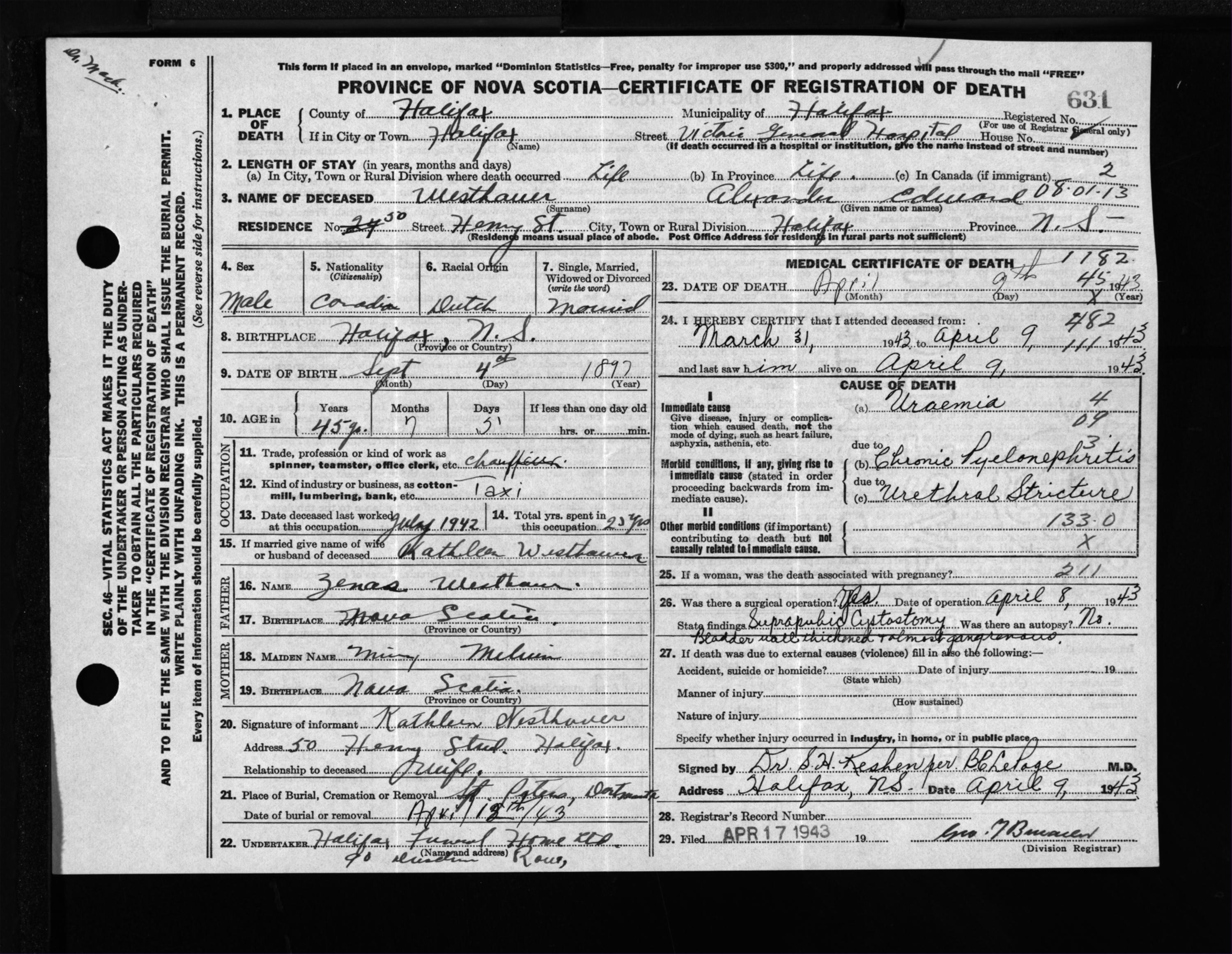 Death Registration: Year: 1943 file: 210 number: 631