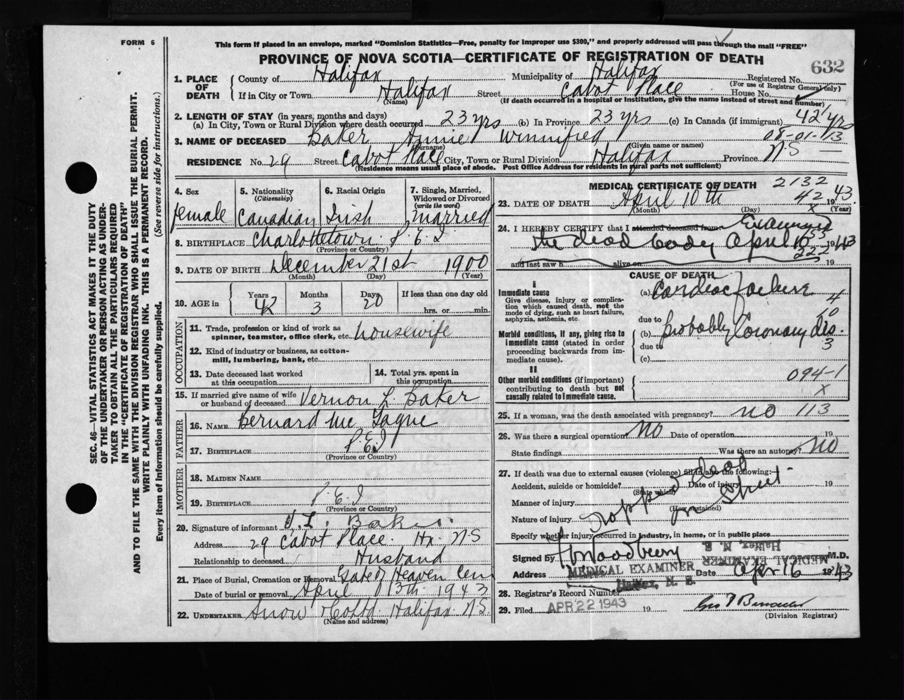 Female Death Registration: Year: 1943 file: 210 number: 632
