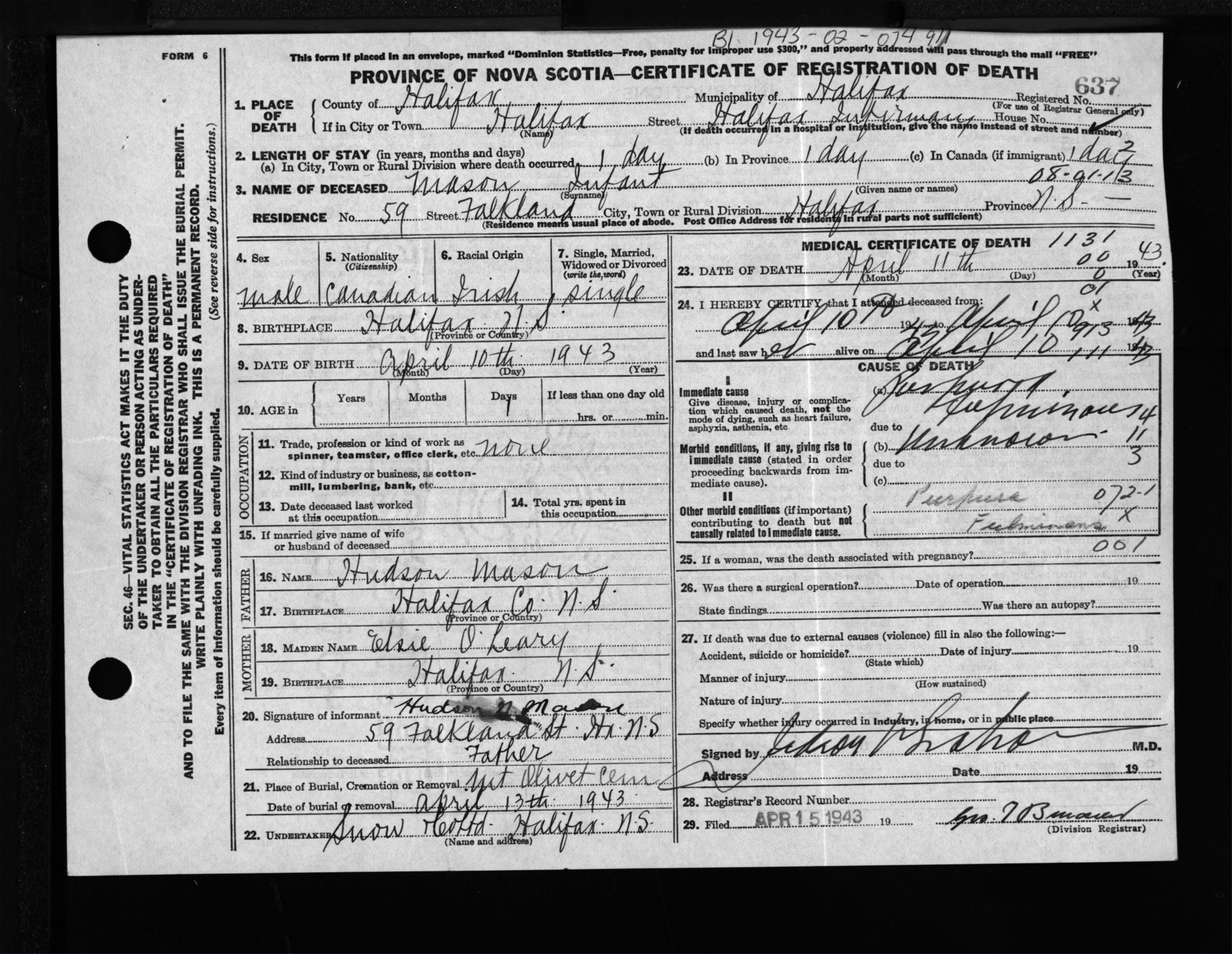 Male Death Registration: Year: 1943 file: 210 number: 637