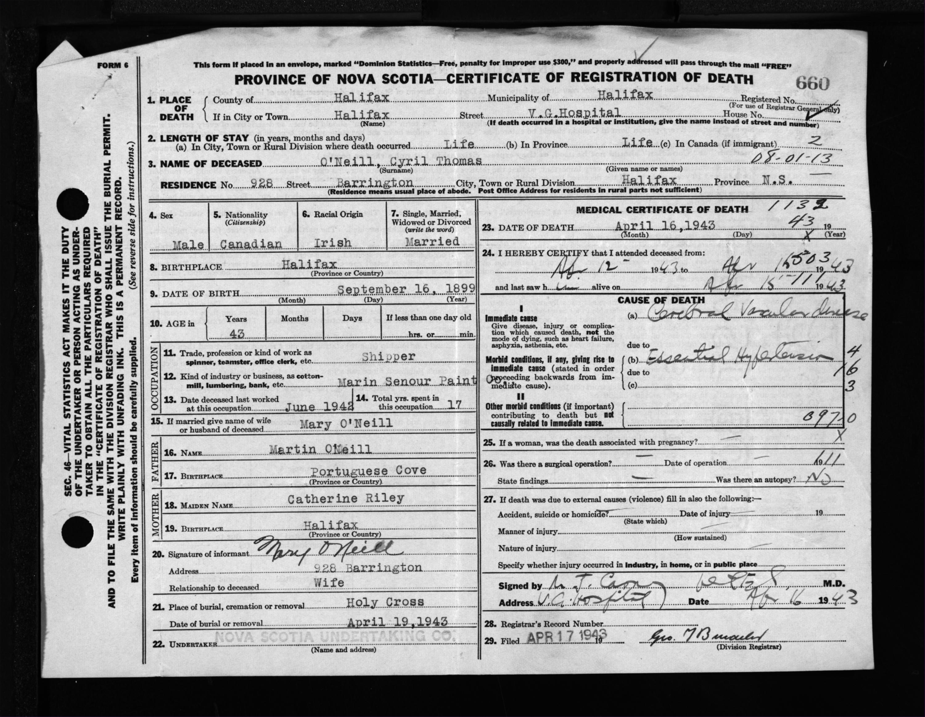 Male Death Registration: Year: 1943 file: 210 number: 660