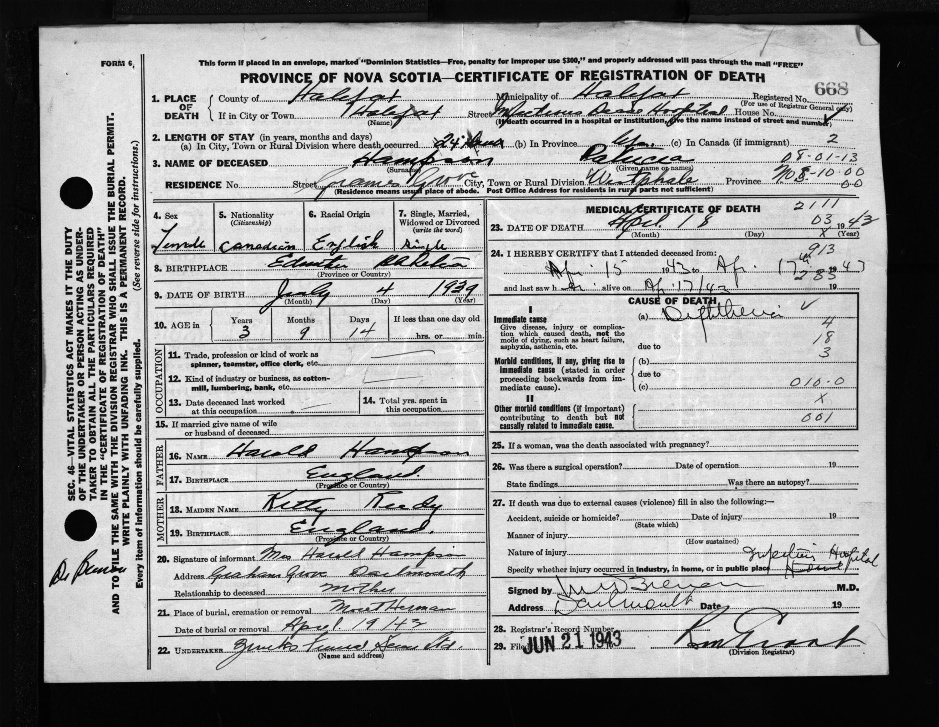 Female Death Registration: Year: 1943 file: 210 number: 668