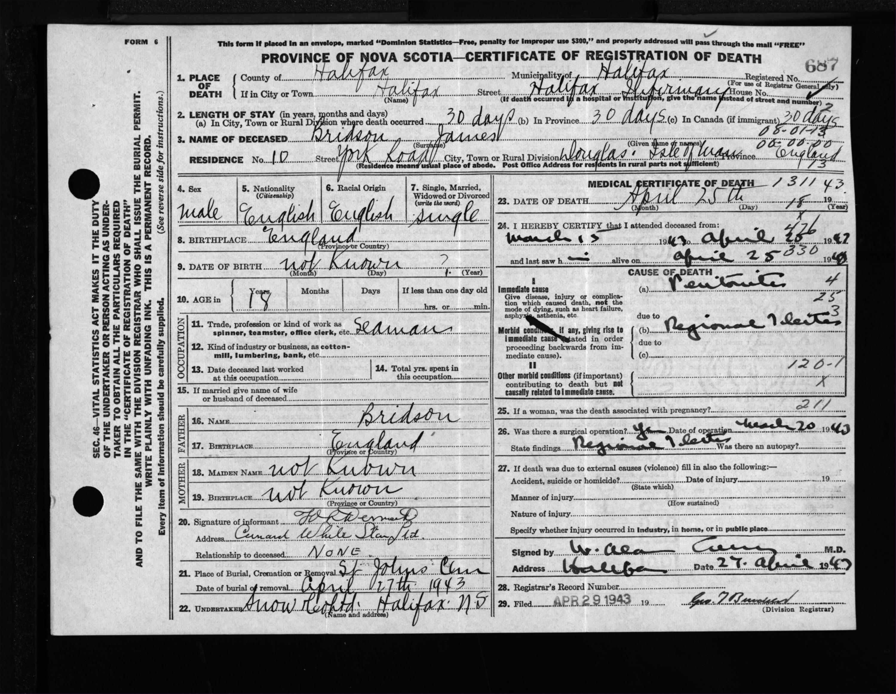 Male Death Registration: Year: 1943 file: 210 number: 687