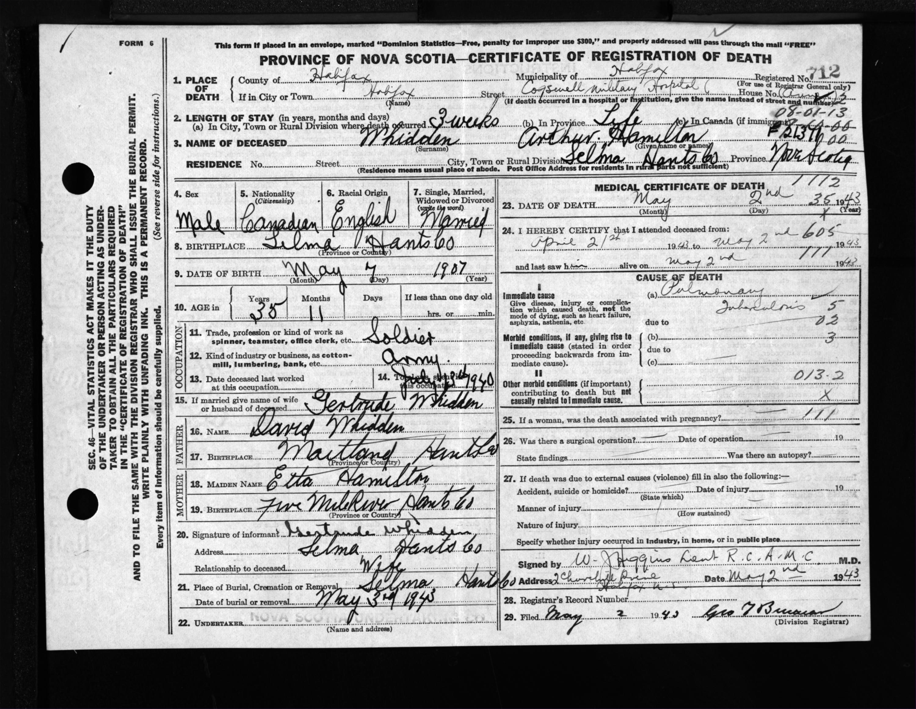 Male Death Registration: Year: 1943 file: 210 number: 712